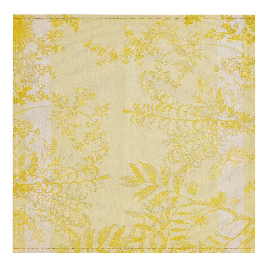 Le Jacquard Francais Jardin d'Eden is soft and graceful. Dive into the elegance of nature, a centerpiece that evokes the magic of paradise gardens. Ivies, maidenhair ferns, and calatheas intertwine delicately, creating a refined decoration to enhance your indoor or outdoor meals. Colored warp and weft. 100% cotton. Combed yarns, long fibers. France.