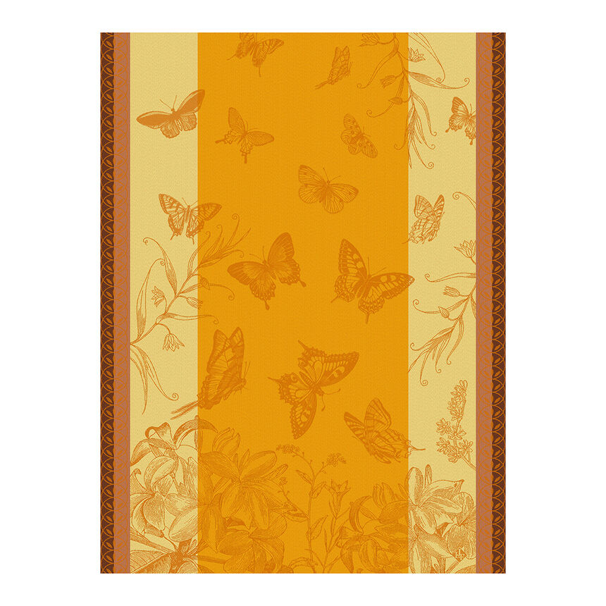 Le Jacquard Francais Jardin Des Papillons Tea Towel features a garden full of butterflies. All shapes and sizes of Butterflies dancing all over the towel. You can also spy at the bottom of the towel gorgeous flowers in full bloom. Made in France.