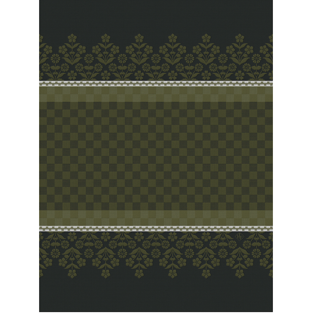 Le Jacquard Francais Lulu Lucien Melisse tea towel is in a deep olive green with white accent. The design is divided into sections with a center that is geometrical and the top and bottom have sweet little flowers. Le Jacquard Français tea towels are a real charm in your kitchen!