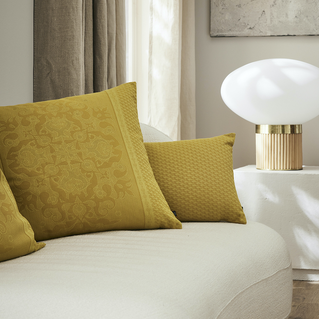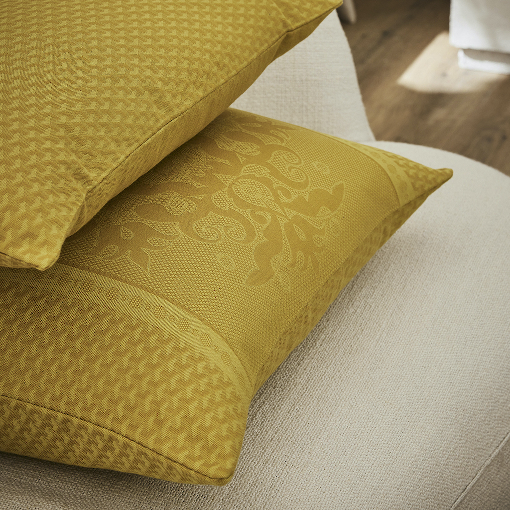 Le Jacquard Francais Palais Venitien Yellow pillows are stately. The design has a magnificent and ornate pattern with a geometric accent. The lumbar pillow is an all over geometric pattern. Palais Venitien is available in three bright jewel tones. Please don't hesitate to play mix and match with the colors and patterns. 100% cotton. Made in France.