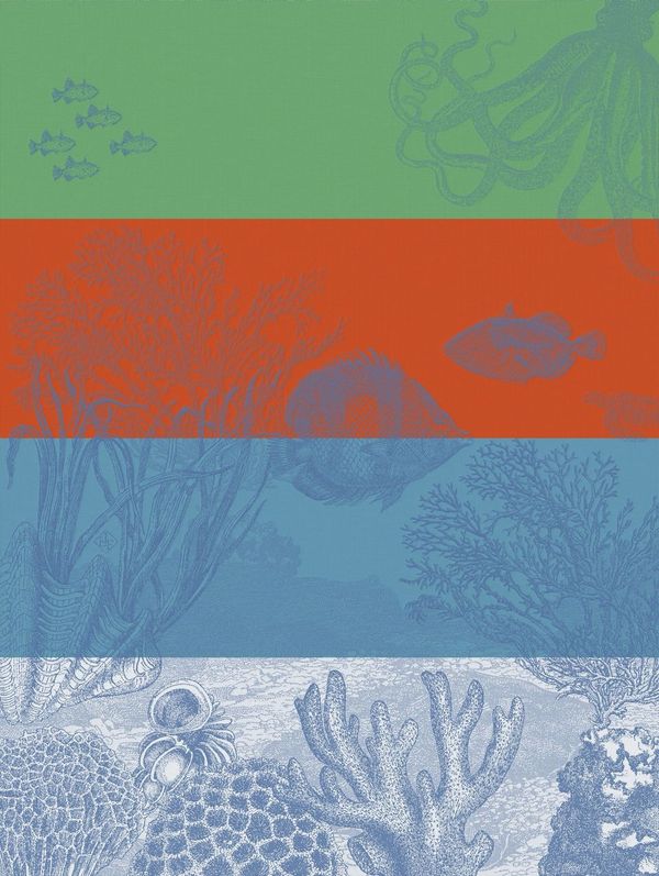 Le Jacquard Francais' Sous L'Ocean tea towel in red is spectacular with colorful broad stripes and an under the sea theme.