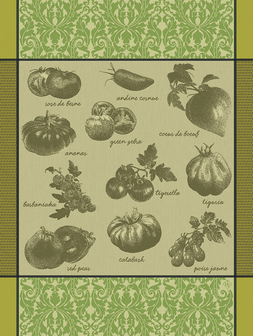 Le Jacquard Francais' Tomates tea towel will invoke in you the desire to create a variety of summer recipes with tomatoes as the main ingredient! A gourmet collection highlighting the immense varieties of tomatoes. The tea towel has a woven label to hang it easily in your kitchen. Available in three colors. 100% long staple combed cotton. France.