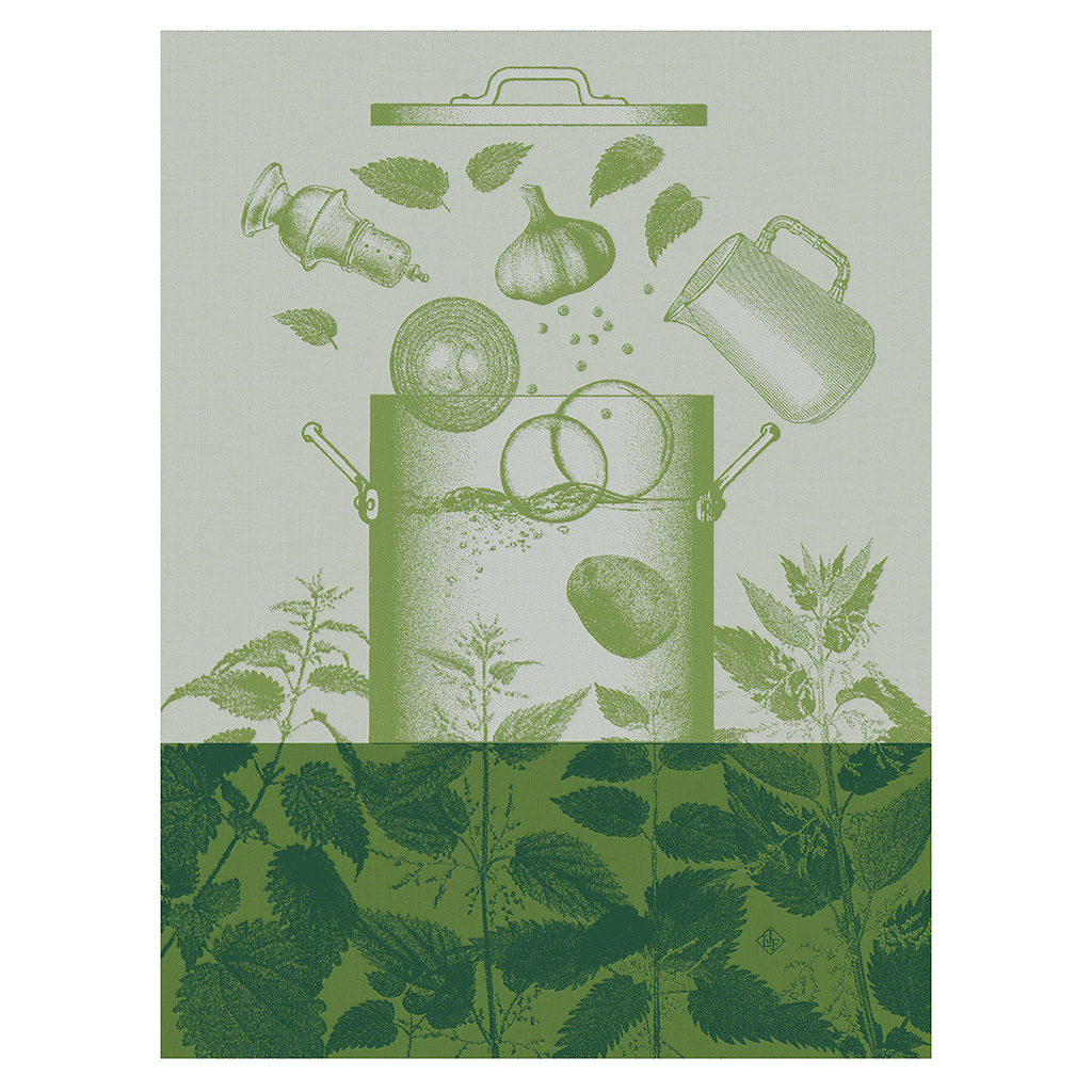 Le Jacquard Francais' Veloutés d'orties tea towels bring a delicate note of freshness and well-being to your decor. The design itself is of the Nettle Soup. Le Jacquard Français tea towels are a real charm in your kitchen! Thanks to their remarkable qualities, which they derive from the quality of their fibers, they will last for years. They have generous dimensions of 24 x 31" and a woven label to hang them easily in your kitchen. 100% long staple combed cotton. France.