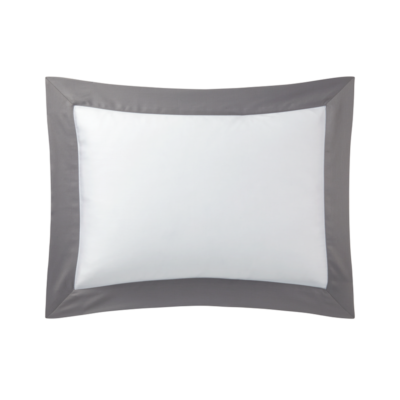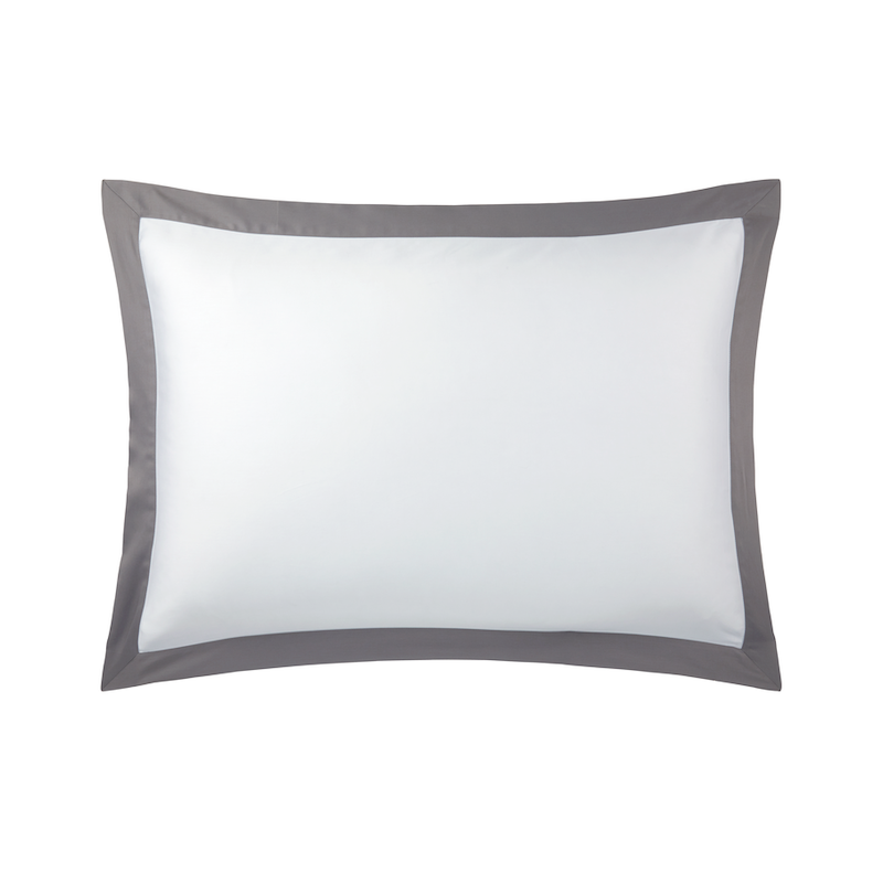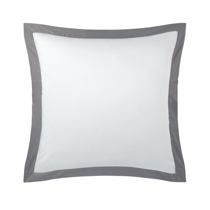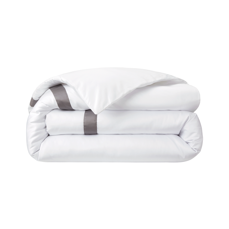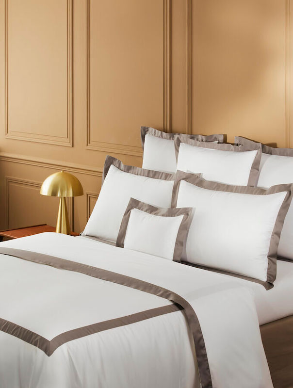 Yves Delorme Linea in Platine has appliqué bands on white cotton sateen. This new, timeless design offers a soft and plush touch of cotton sateen combined with the natural and refined colors Sateen bed linens. Duvet cover with colored sateen appliqué in U shape - button finish, flat sheet with 2” hem in colored sateen, shams with 2" flounce in colored sateen. 100% long staple combed organic cotton from organic farming, 300 thread count. Made in France.