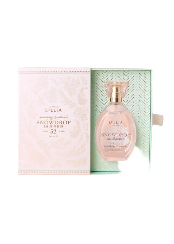 Lollia's Snowdrop Eau de Parfum captures the serene beauty of a delicate frost at dawn with a refined blend of Winterberry, White Woods, Bergamot, Camellia, and soft Cashmere. This enchanting fragrance offers a subtle yet captivating scent experience. Encased in a luxurious special reserve box featuring an etched-frost design with golden accents, the elegant teardrop glass bottle is displayed in a distinctive floating encasement, making it a sophisticated addition to any fragrance collection.
