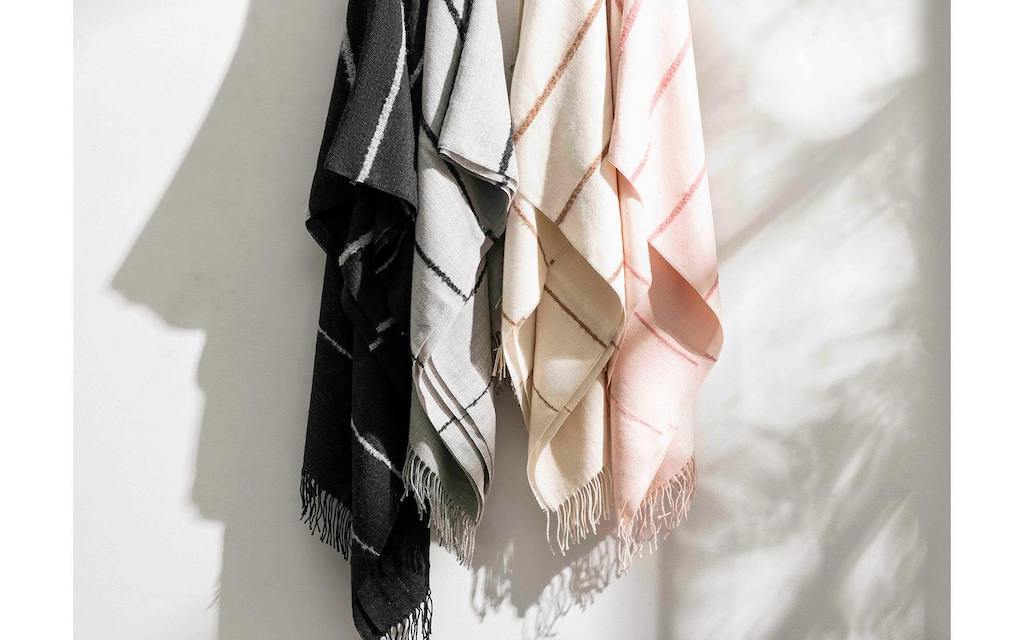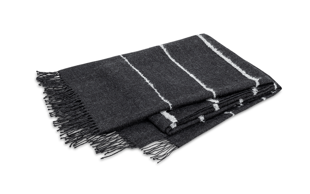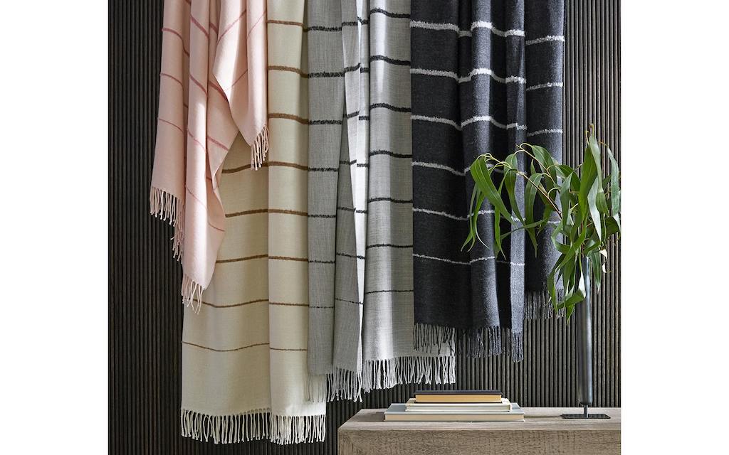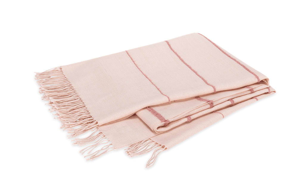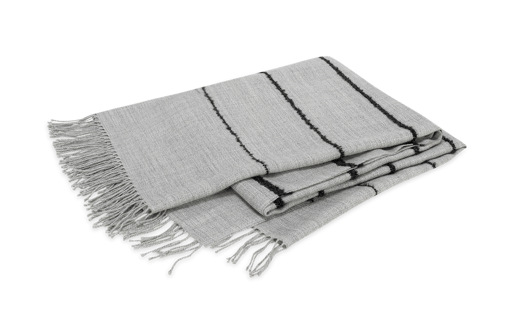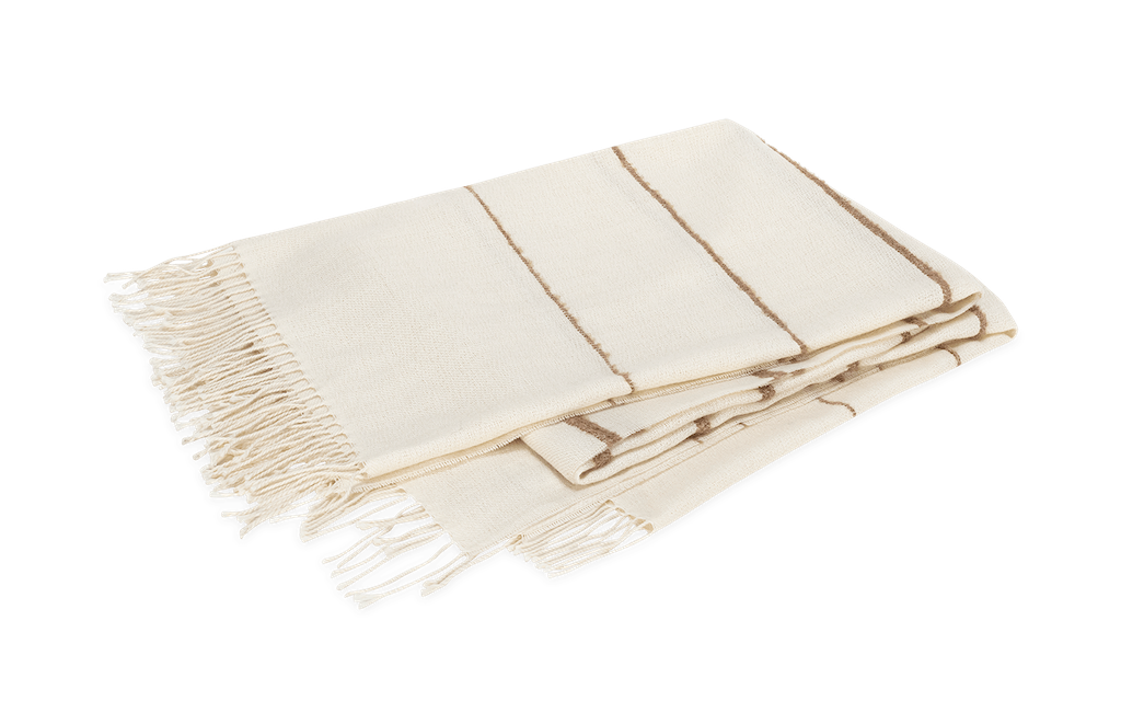 Matouk's Amelia Stripe is a throw and a luxurious travel wrap. Amelia features a boucle stripe in a basketweave pattern. Throw has a fringe finish. Available in several colors. 100% Baby Alpaca. Made in Peru.