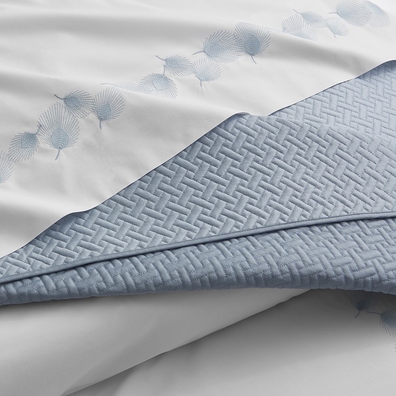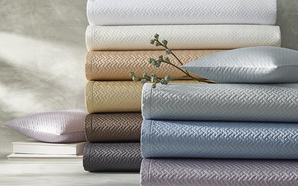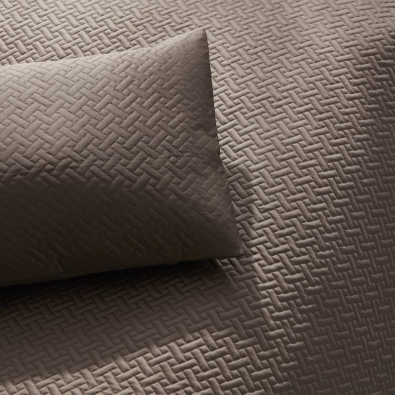 Matouk's Basketweave is a delicate quilted pattern collection. The design consists of multiple horizontal strands and vertical strands, resulting in a square pattern associated with woven baskets. Crafted from luxurious Nocturne sateen. Basketweave Quilts are backed in 300TC sateen. Filling is made of 100% polyester batting, 100gm per square meter. Knife edge finish. Made in the USA of fabric from Italy. Shown with Lowell bedding in Mocha.