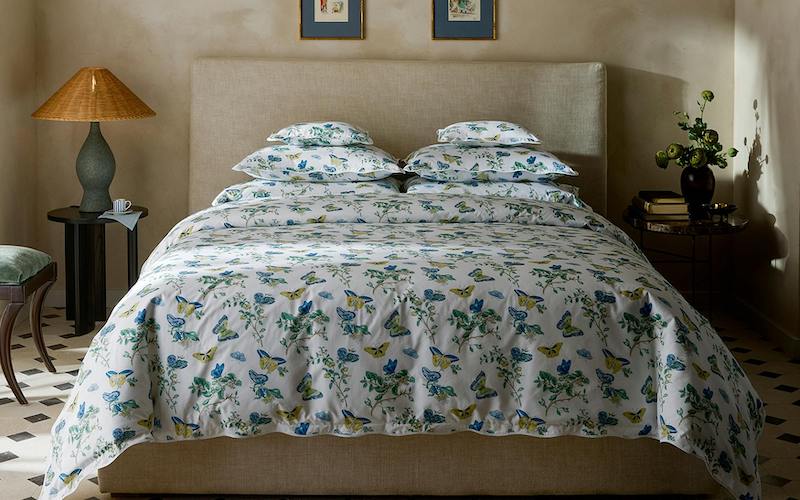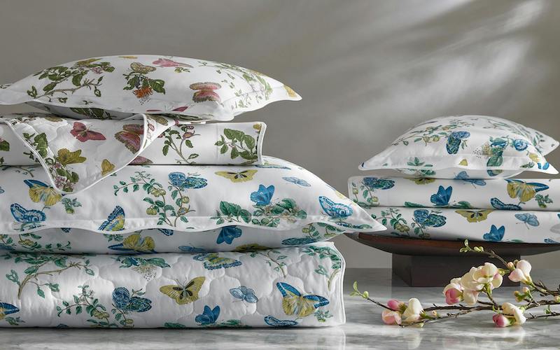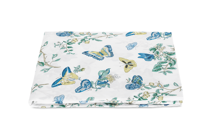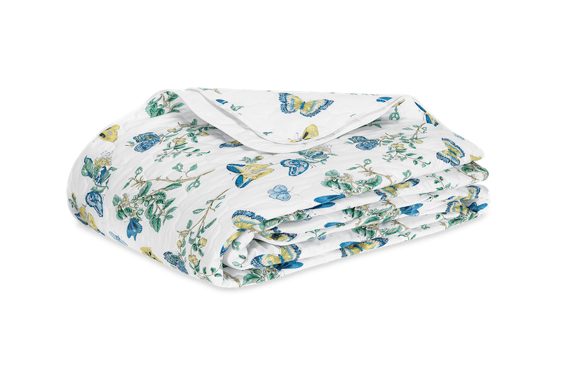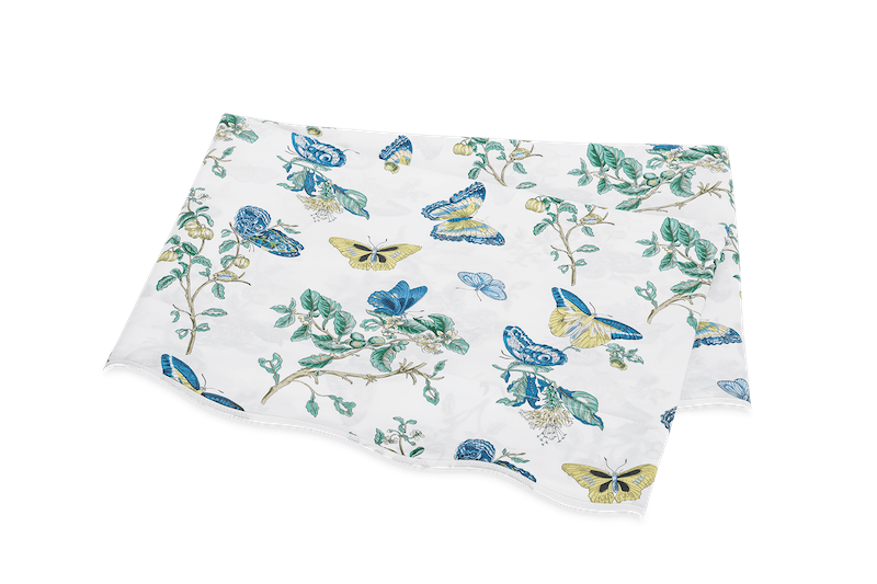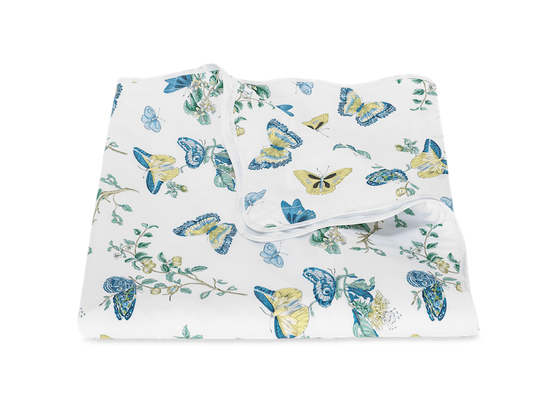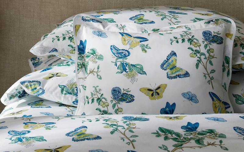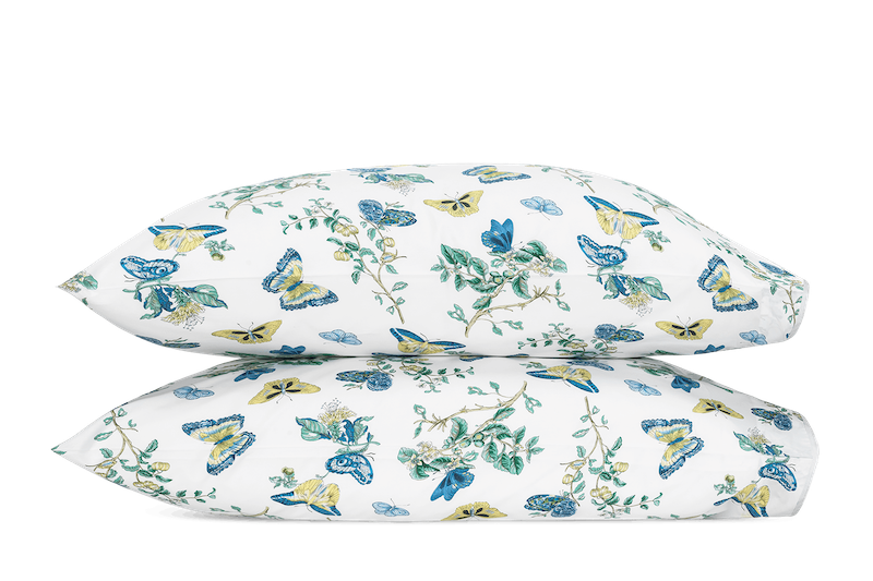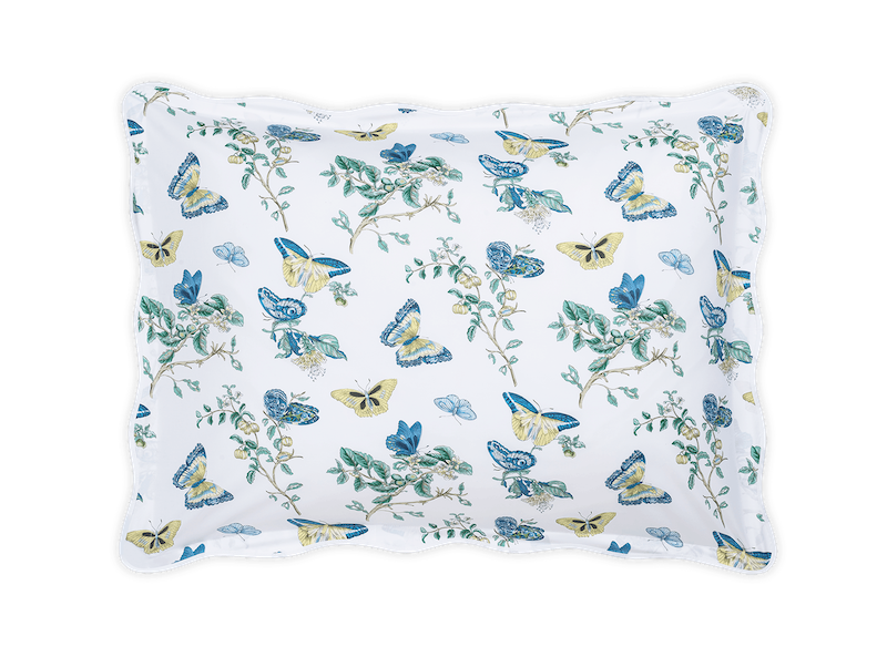 Matouk Baudin Butterfly in Prussian Blue is delightful. This Schumacher print has an enchanting mix of butterfly and botanical motifs. It’s elegantly finished with a scalloped trim, adding an extra note of refinement. Luca 500 thread count Egyptian cotton percale. Made in the USA of fabric from Italy.