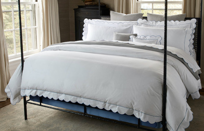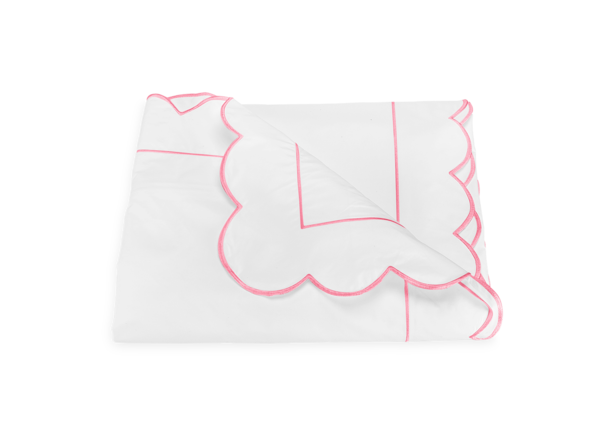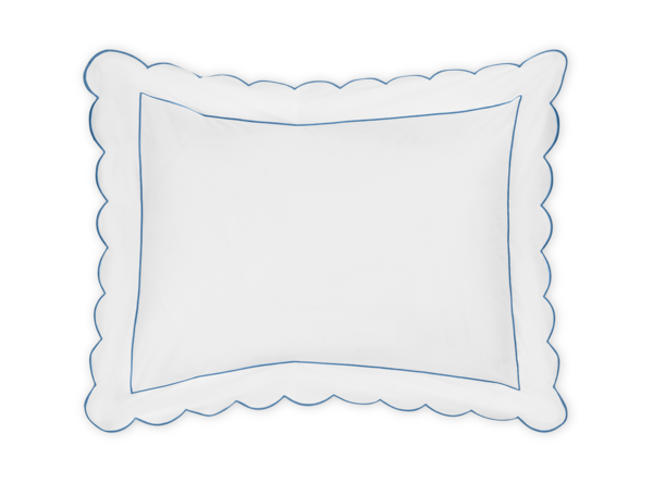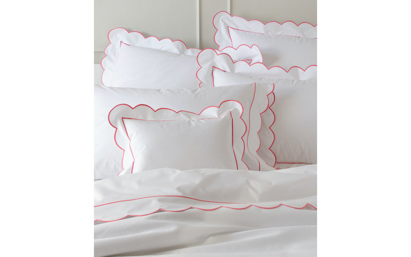 Matouk's Butterfield is sassy and classic. Using Luca their crisp white percale sheeting and adorning it with satin stitching on the oversized scalloped edges you get a feminine and tailored look. Available in several different satin stitch colors. 500 TC Egyptian Cotton woven in Italy. Butterfield fitted sheets are Luca Sheeting. Made in the USA.