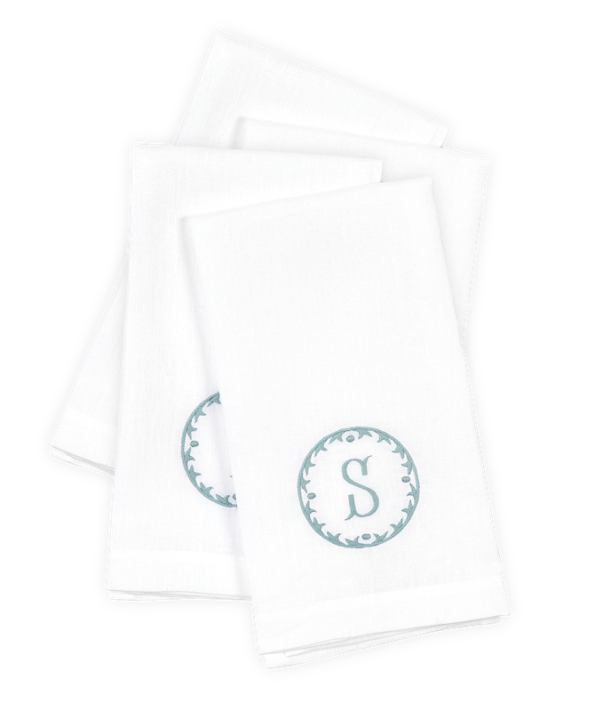 Sferra's Carta Guest towels are 100% linen with a medallion made of fishtail embroidery with your choice of monogram. Sold individually.