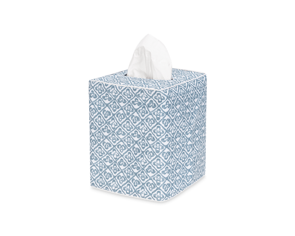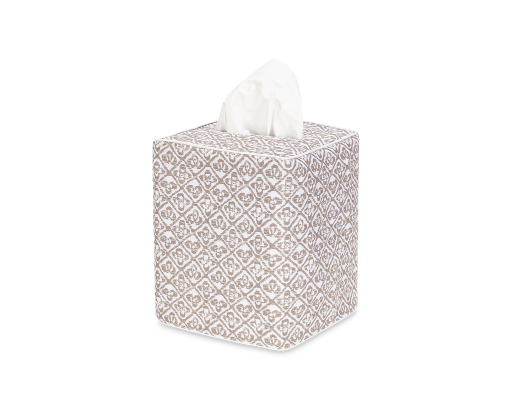 Matouk's Catarina Tissue Box Cover has a small-scale, delicately faded quatrefoil motif. Schumacher's fabric archive comes to life across the smooth Luca percale, introducing a rich textural geometry. Available in a choice of vintage-inspired colors. Luca 500 thread count Egyptian cotton percale. The perfect finishing touch for bedrooms and bathrooms. 100% Egyptian cotton outer shell with 100% linen lining. Made in the Philippines of fabric from Italy.