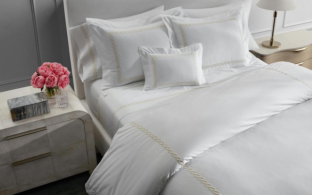 Matouk's Classic Chain Collection is simple and classic. The chain is reminiscent of a simple Greek design. The chain itself flows elegantly on a chic white percale. Embroidered on Matouk's white Sierra 350 TC 100% cotton percale.