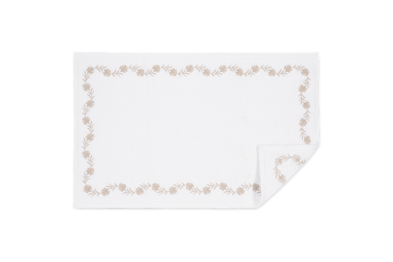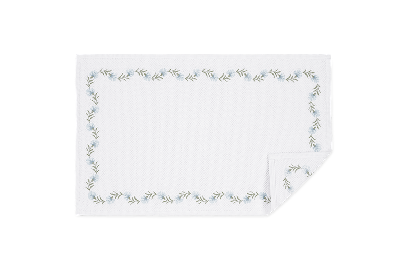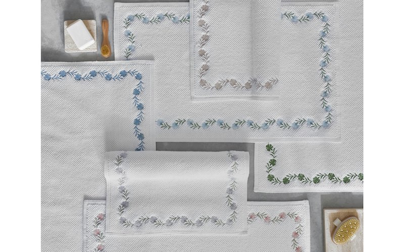 Matouk's Daphne Towels has a delicate floral embroidery that adds a pop of color on the small Reverie Rug. They have a non slip back. 100% cotton, 625 gsm. Rugs are made with embroidery in a framed pattern. Made in the USA of fabric from Portugal.