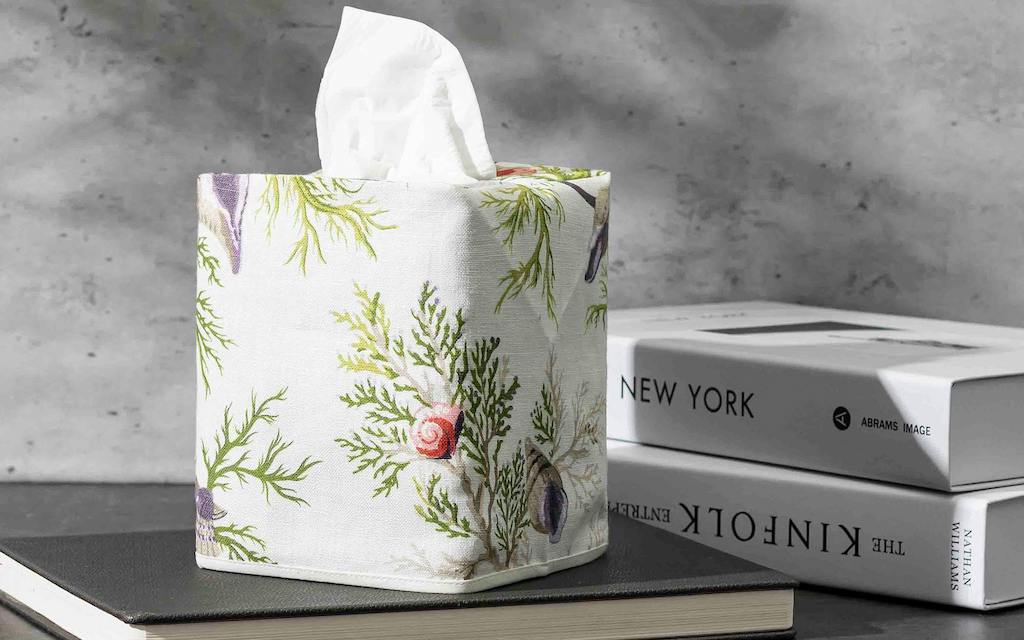 Matouk's Del Tesoro Linen Tissue Box Cover in Sea Orchid has a Schumacher toile design that is colorful and whimsical. The underwater elegance of Del Tesoro with the maritime creatures is enchanting and beautiful. Available in two color ways. 100% Linen. Made in the Philippines of fabric from Portugal.