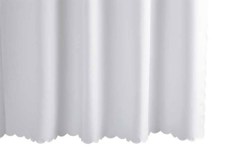 Matouk's Diamond Pique Scallop Shower Curtain is sweet and preppy. Its subtle diamond pattern is a classic and is perfect for that white bathroom look. Scallop detail. 70 % cotton and 30% polyester. Made in USA.