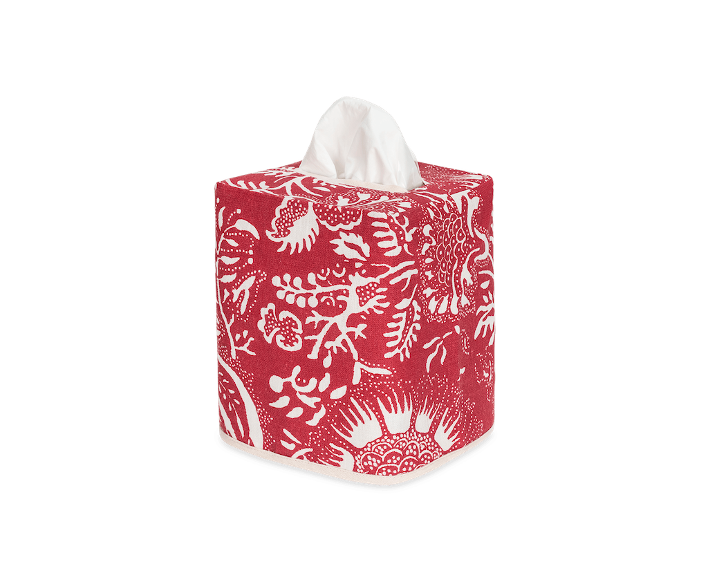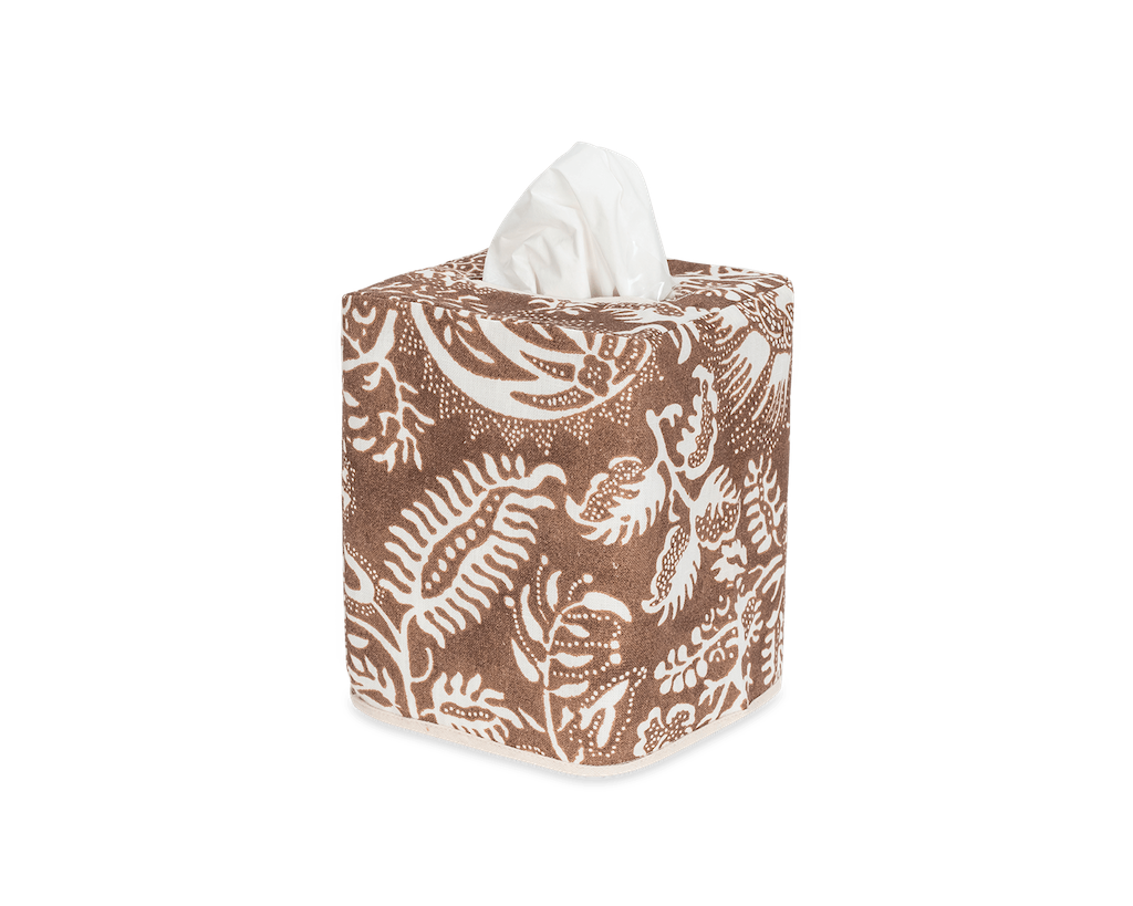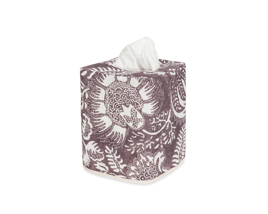 Matouk's Granada Linen Tissue Box Cover's intricate pomegranate print brings an Old World bohemian charm to a crisp cotton percale. With subtle tonal variations inspired by the handcrafted nature of block print textiles, this style is ideal for artful layering in your bathroom. Coordinate with sheeting or shower curtains to give a warm, cohesive look in bedrooms and bathrooms. 100% linen. Made in the Philippines of fabric from Portugal.