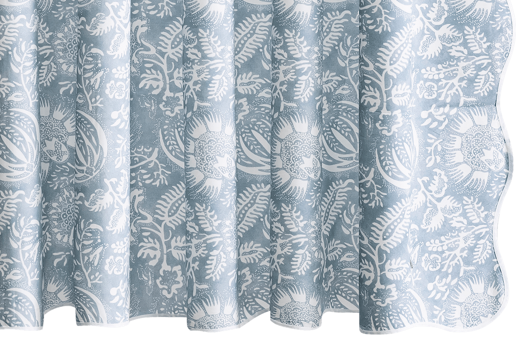 Matouk's Granada Shower Curtain's intricate pomegranate print brings an Old World bohemian charm to a crisp cotton percale. With subtle tonal variations inspired by the handcrafted nature of block print textiles, this style is ideal for artful layering in your bathroom. Luca 500 thread count Egyptian cotton percale. Our Shower Curtain has button holes. Made in the USA of fabric from Italy.