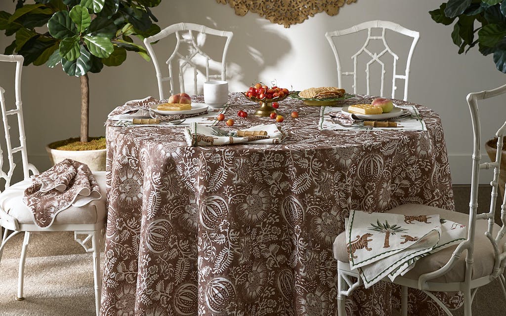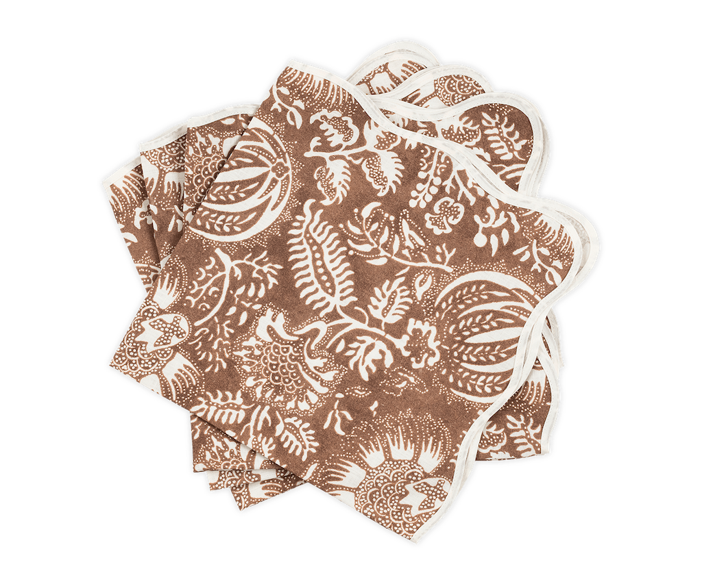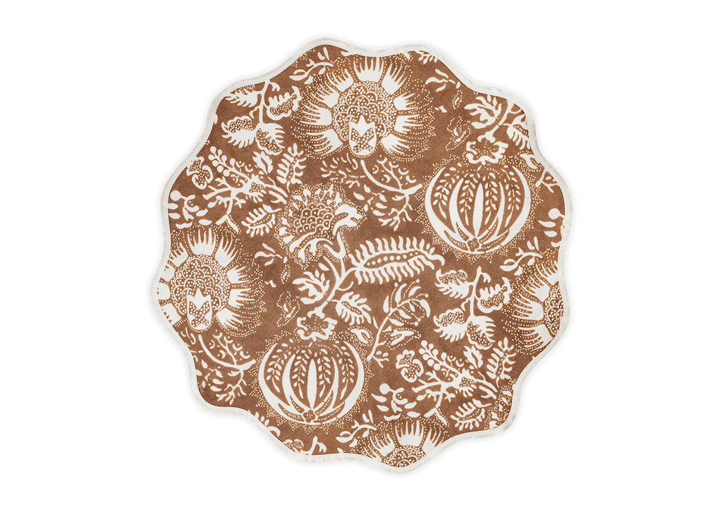 Matouk Granada Table Linens are a Schumacher Botanical featuring abstract pomegranates. Hand-dyed textiles serve as inspiration for this intricate Schumacher collection. Perhaps history's most revered fruit, the pomegranate is believed to represent marriage, birth, prosperity, hope and abundance, adding meaning and merriment to these new table linens; finished with our scallop piped edge. 100% linen. Made in the USA of fabric from Portugal. All of our fabrics are OEKO-TEX Standard 100 certified, meaning they are safe for you and for the planet.