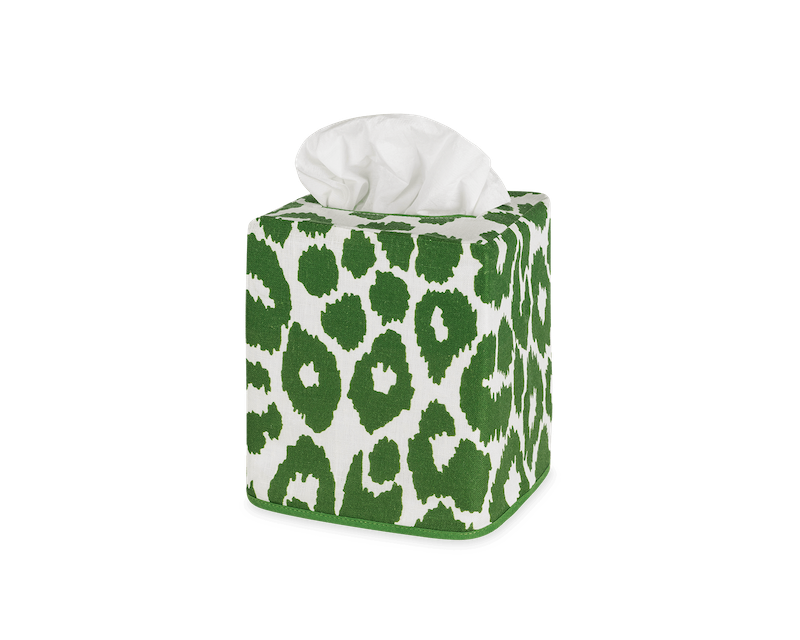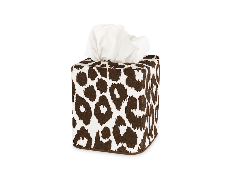Matouk Iconic Leopard Tissue Box Cover is from the design that Schumacher introduced in the 1970's. Schumacher’s Iconic Leopard is alluring and endlessly chic. It is available in three versatile hues. 100% printed linen. Made in the Philippines of fabric from Portugal.