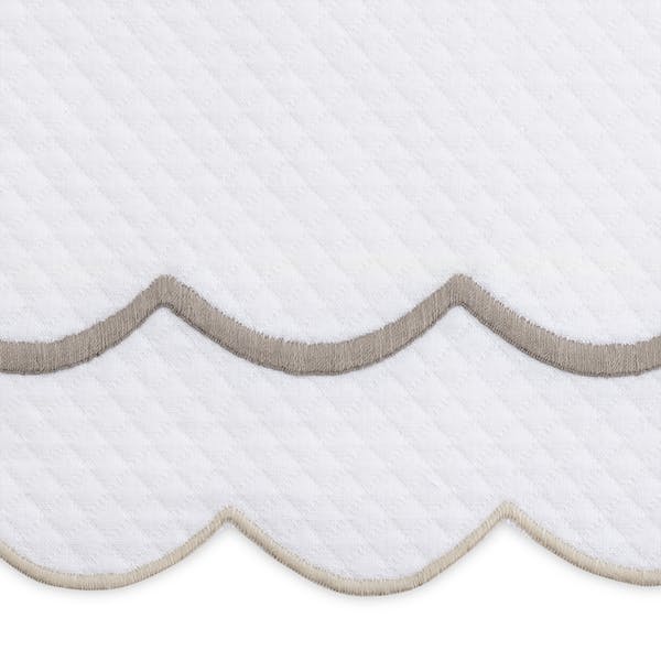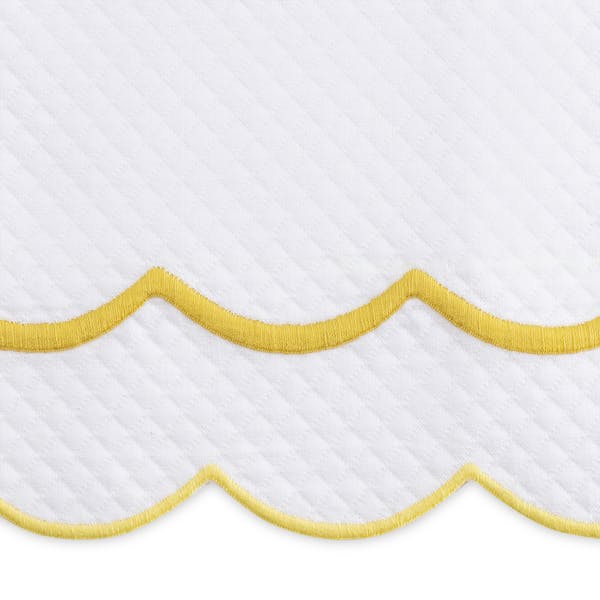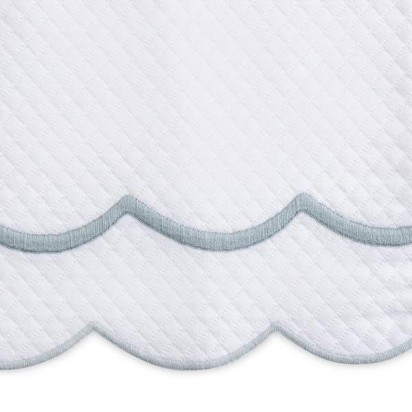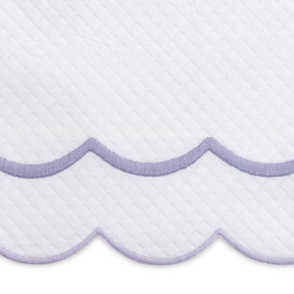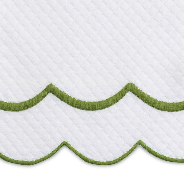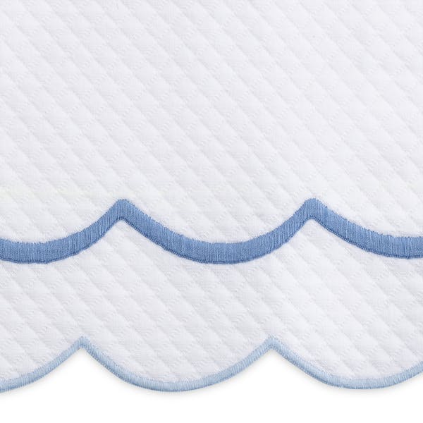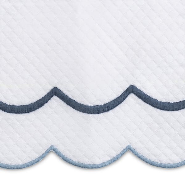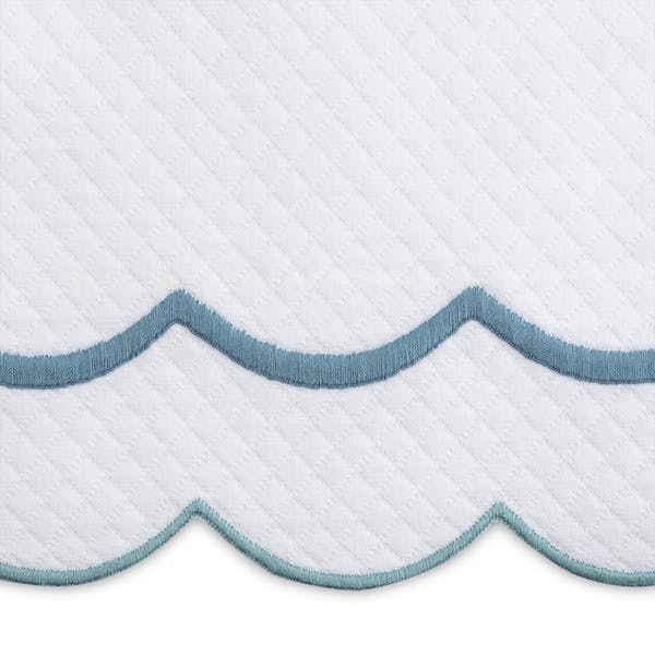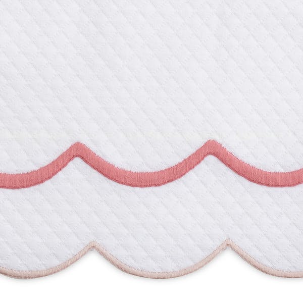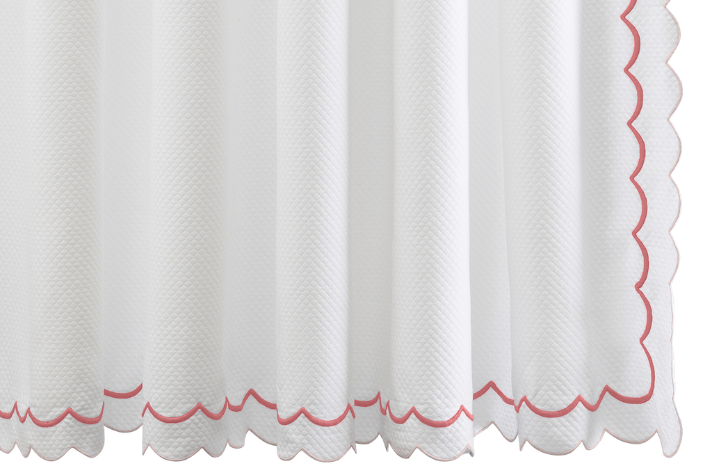Matouk's India Pique Shower Curtain has a delicate quilted pattern collection. This playful take on line and color sees Matouk's popular India double-scallop embroidery on diamond piqué matelassé. Crafted in an easy to care for cotton blend, the style features two-tone edges in a range of delicious hues. 70% cotton/30% polyester.  Made in the USA of fabric from Portugal.