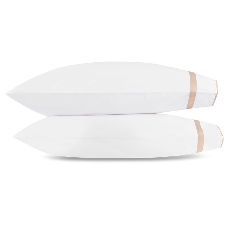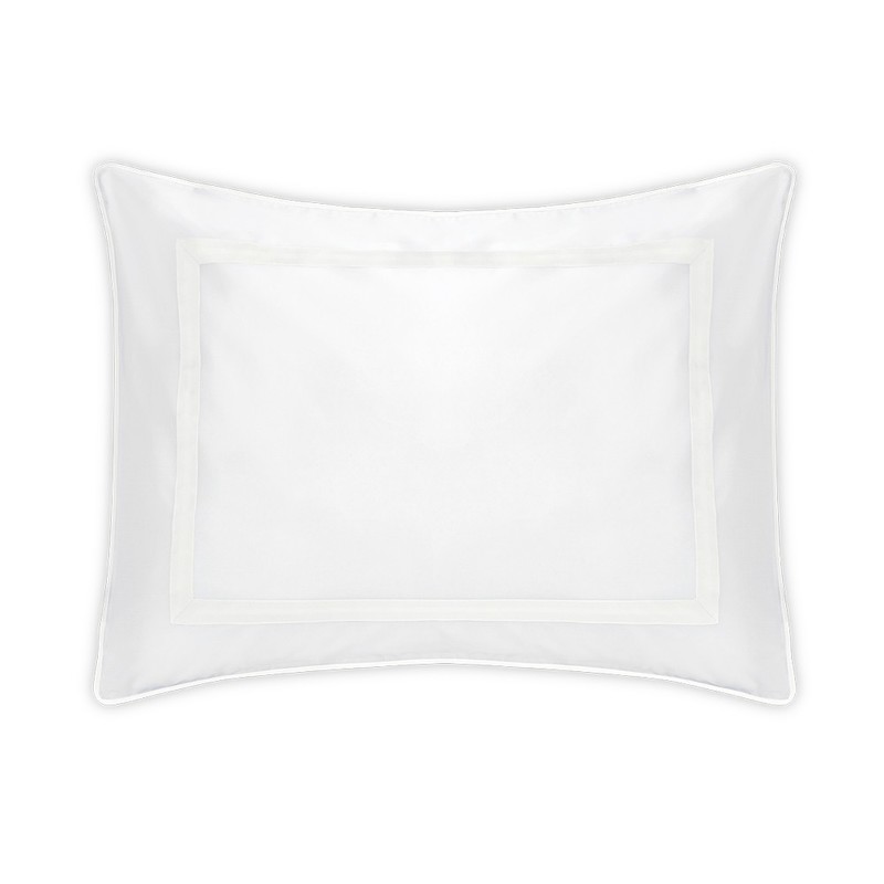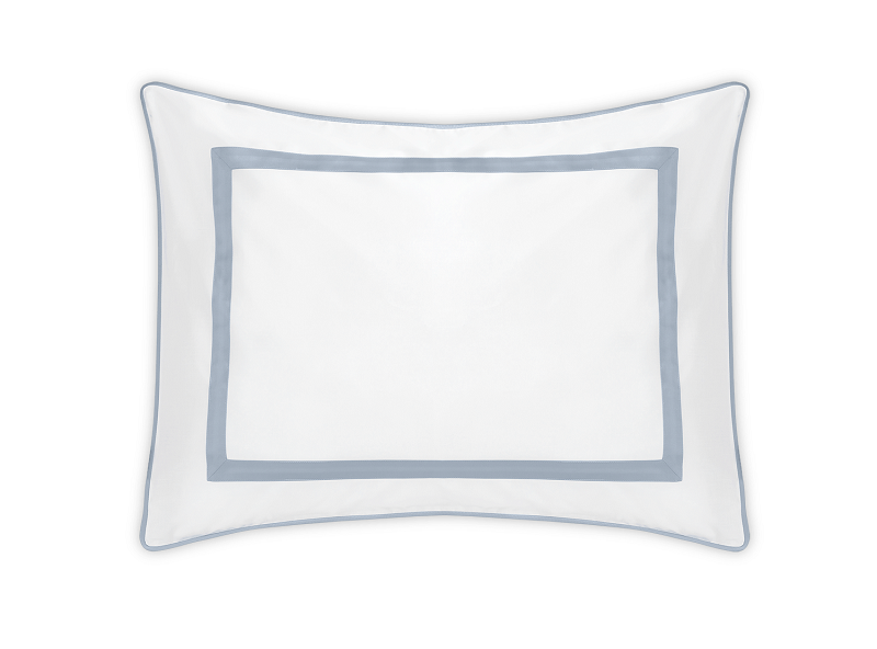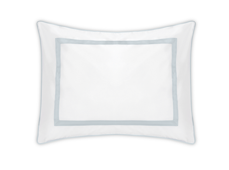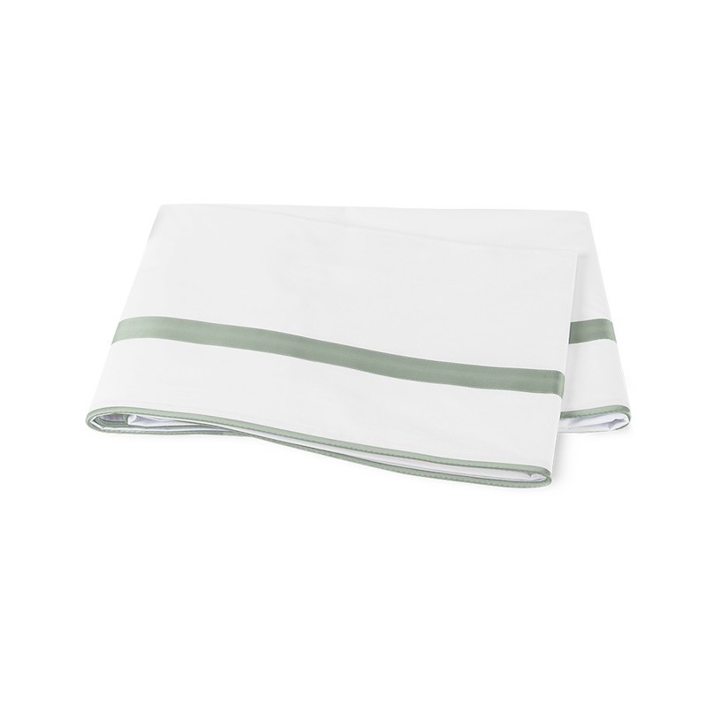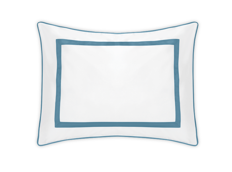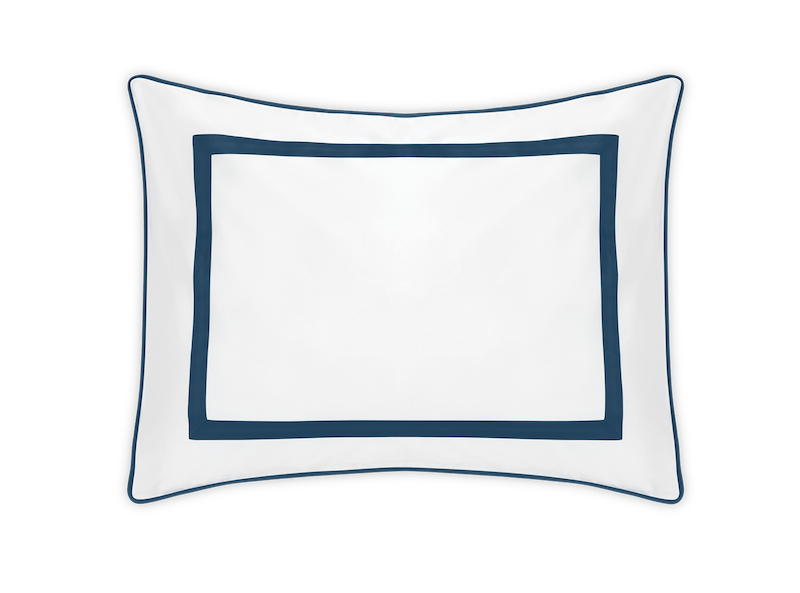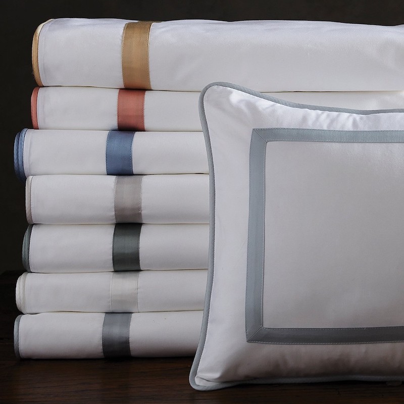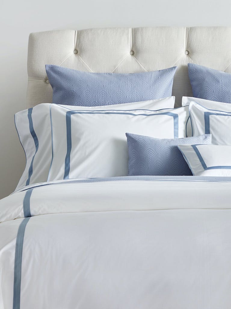 Matouk's Louise is Matouk's smooth Bergamo Giza Egyptian cotton percale with appliqués and knife-edge cording of colorful Nocturne, a 500 thread count Egyptian cotton sateen. A clean corded knife edge finish the duvet cover and shams. Louise Fitted Sheets are "Bergamo" sheeting. Made in the Philippines of fabric from Italy.