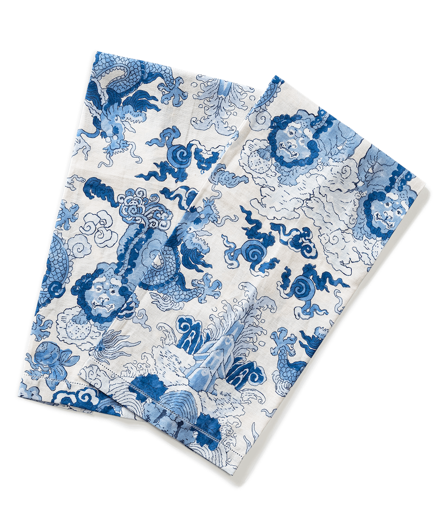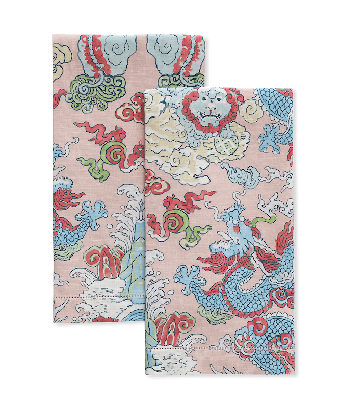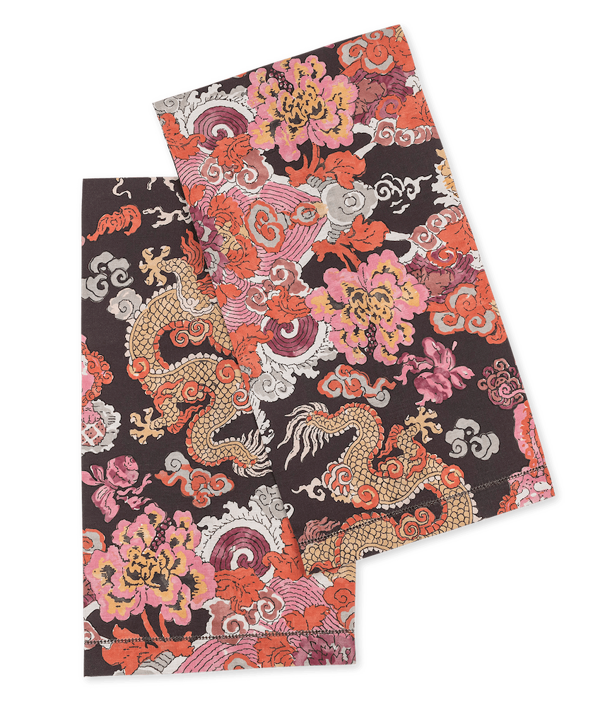Matouk's Magic Mountain Guest towels celebrate the fantastical motifs of ancient myth and legend, Schumacher's Magic Mountain features a psychedelic formation of foo dogs and fire-breathing dragons. Set of two. 100% linen. Made in the USA of fabric from Portugal.