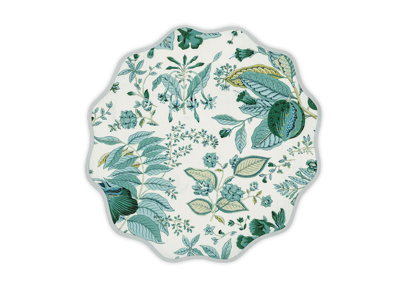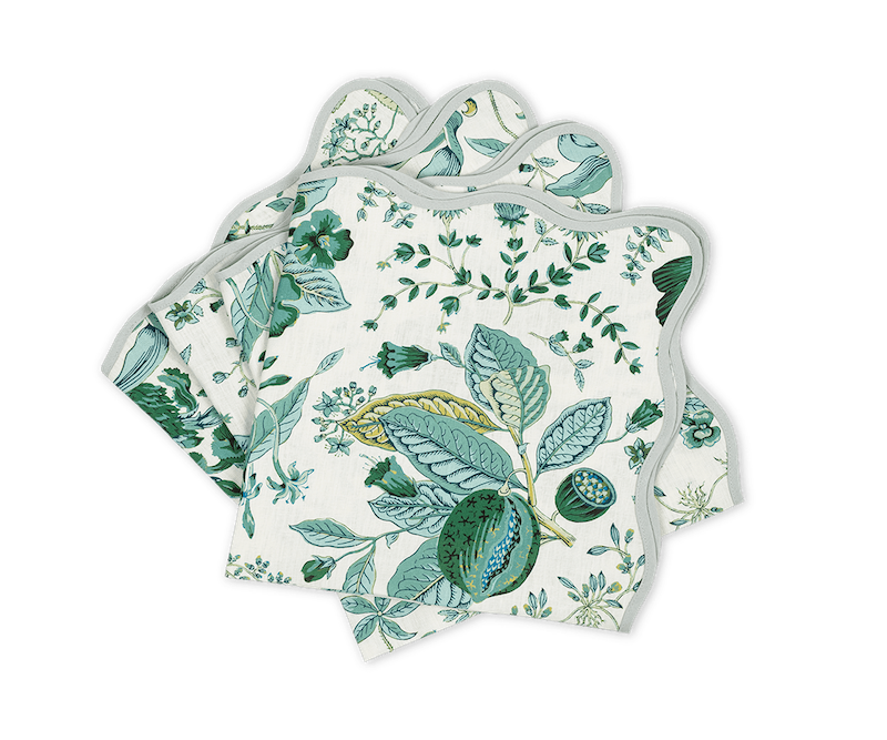Matouk Pomegranate Table Linens are full of vibrant florals and foliage. Schumacher's Pomegranate design that appears on one of the most popular bedding styles is also available for the table. Here, it’s printed on our 100% linen with a scalloped edge to add a colorful, creative touch to any meal or celebration. 100% linen. Made in the USA of fabric from Portugal.