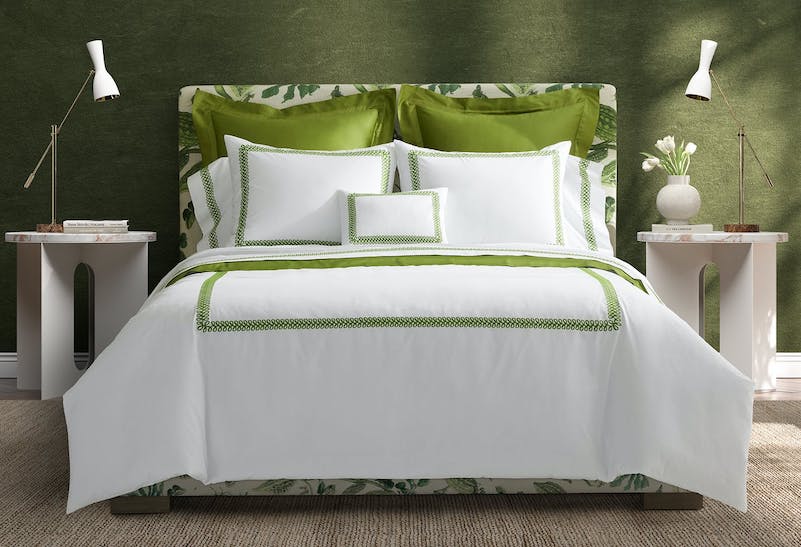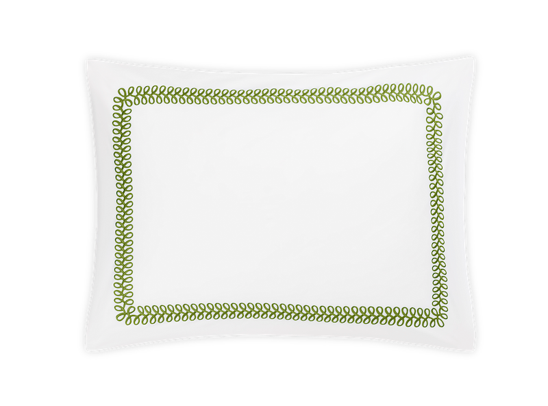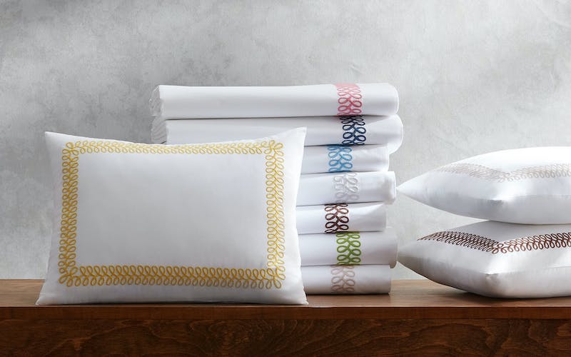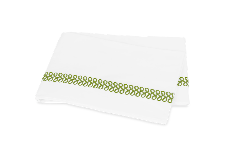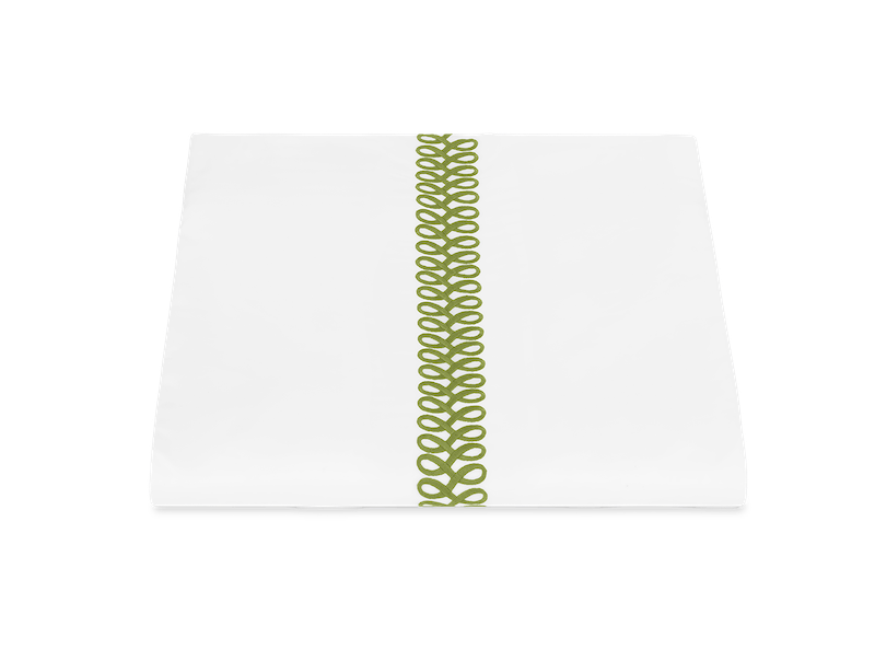 Matouk's Astor Braid Collection is a tribute to Schumacher's collection of tapes and trims. Astor Braid has an embroidered design of a timeless script in several beautiful colors. The embroidery is on 520 thread count cotton percale. This collection is designed to pair with solids or patterns from Matouk's extensive bedding collections. Duvet cover and shams have a knife edge finish. Astor Braid Fitted Sheets are "Ceylon" sheeting.