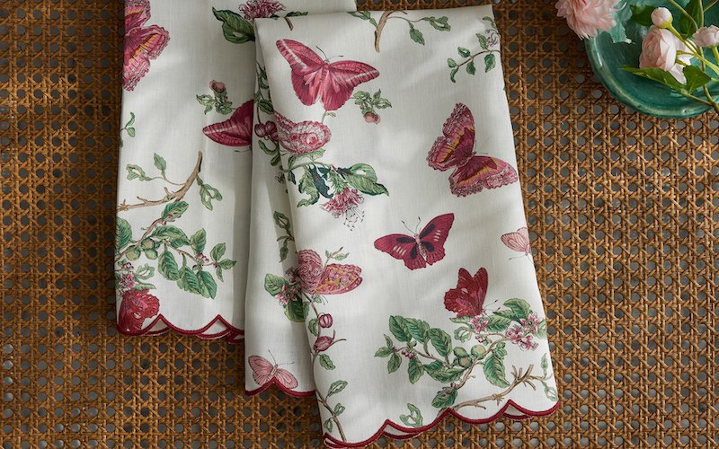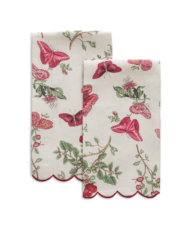 Matouk's Schumacher Baudin Butterfly Linen Guest Towels have a beautiful and fanciful look. The linen towels have a delightful Matouk Schumacher print with an enchanting mix of butterfly and botanical motifs. It’s elegantly finished with a scalloped trim, adding an extra note of refinement. 100% Linen. Made in the USA of fabric from Portugal.