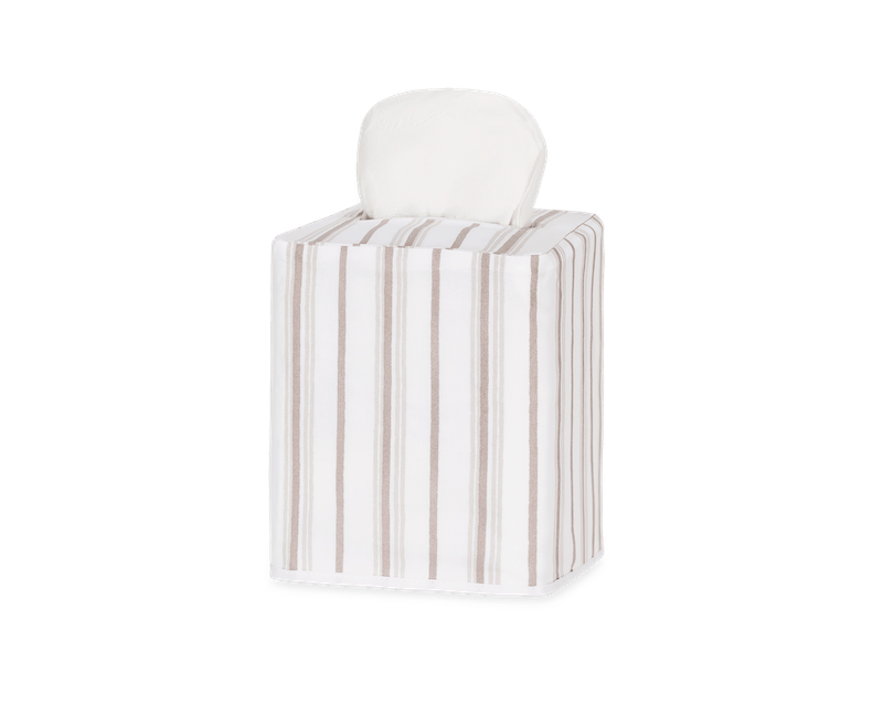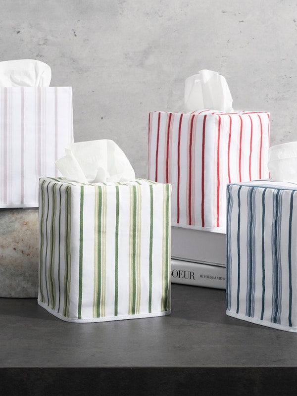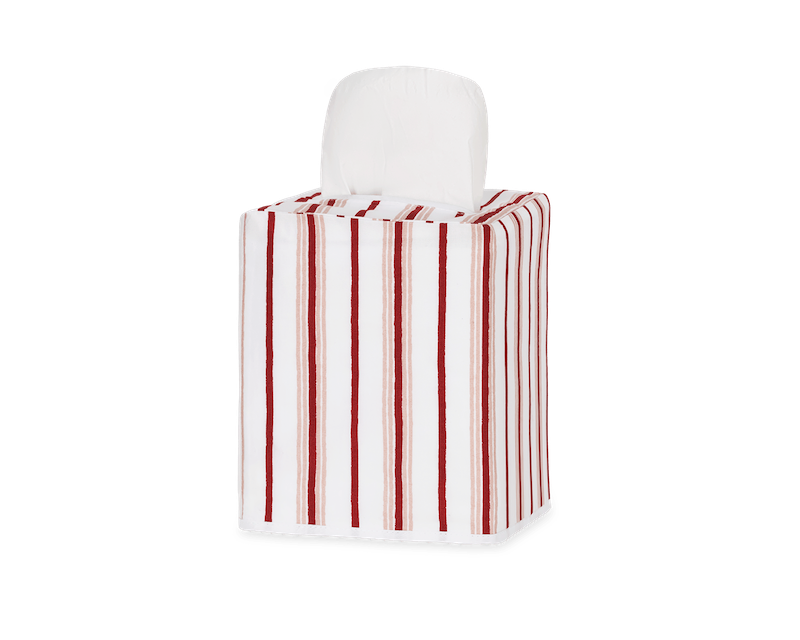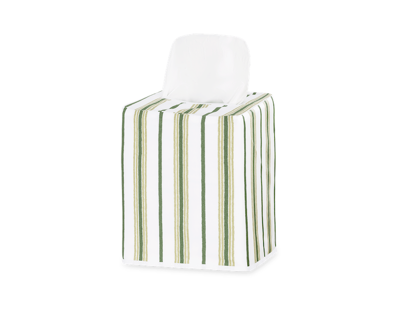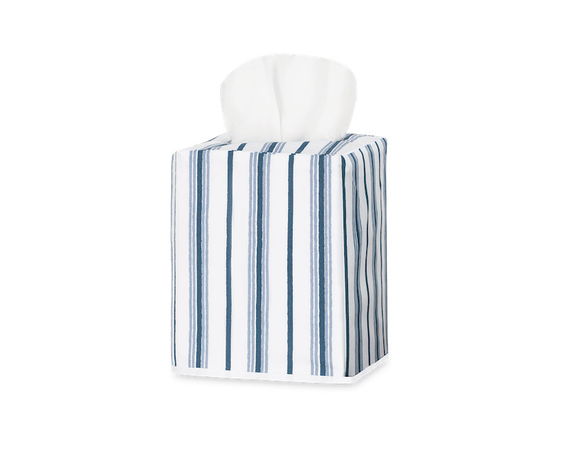 Matouk's Calypso Tissue Box Cover has a Schumacher stripe patterned collection that features alternating pinstripes, bringing sophisticated style and understated elegance to your space. The tissue box cover comes in fresh colors that offer a tailored, classic charm to any room. 100% Egyptian cotton percale. 100% linen lining. Made in the Philippines of fabric from Italy.