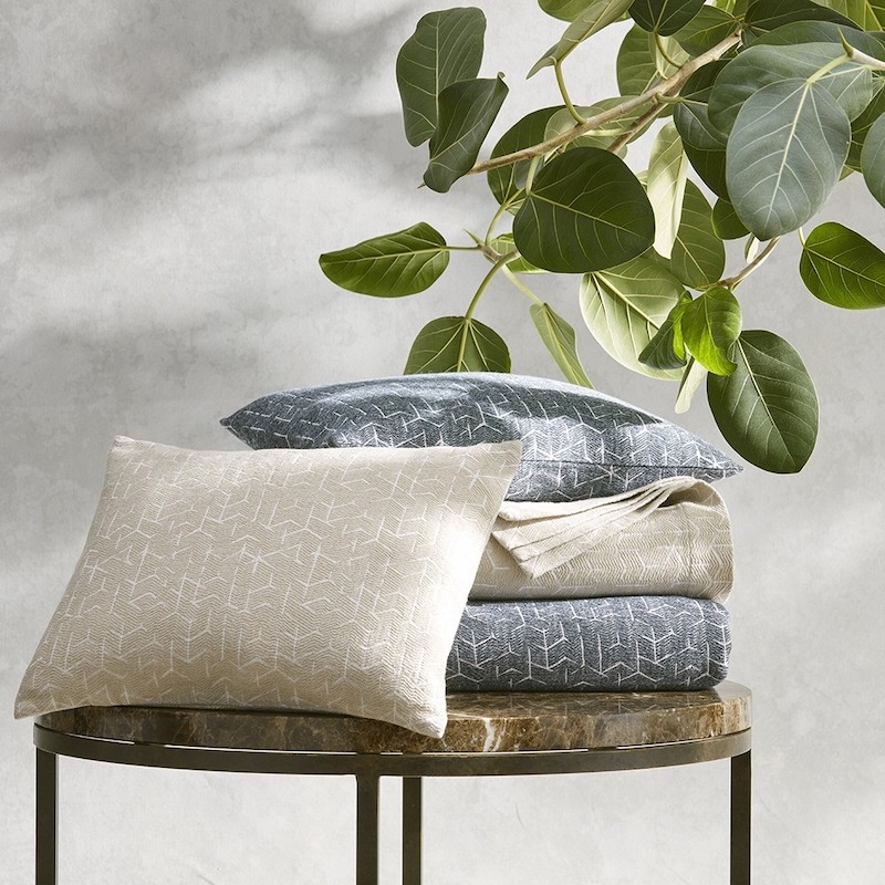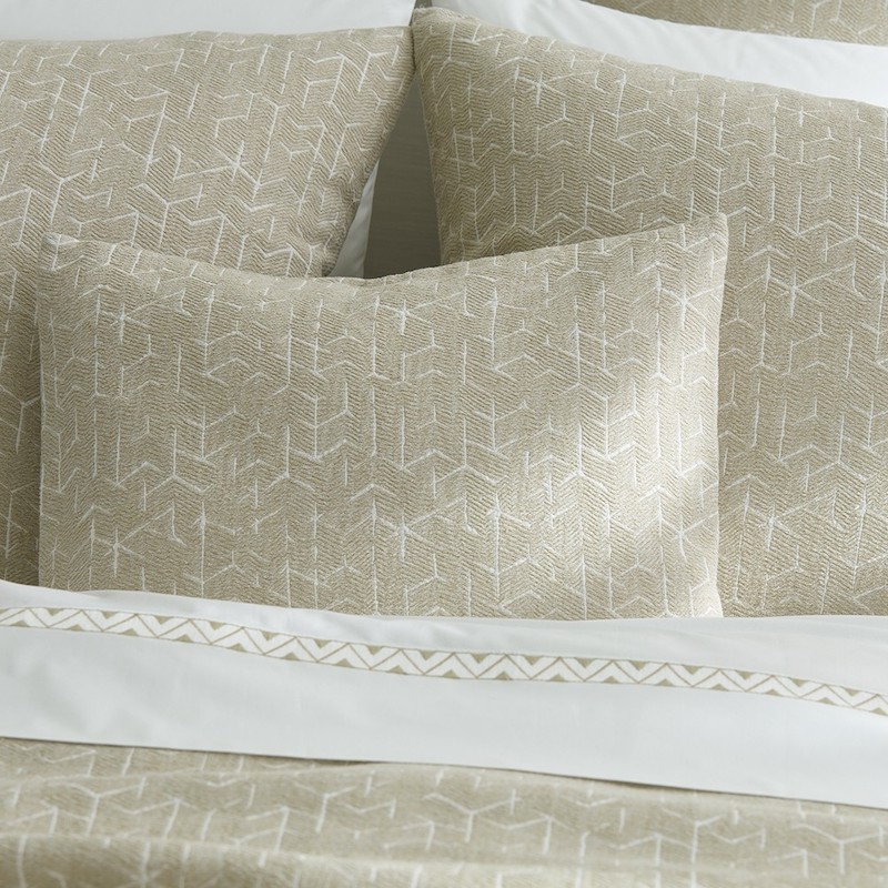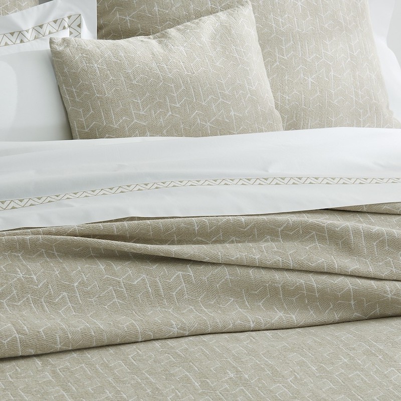 Matouk's Coleridge collection is a textural and visual delight. It has an interesting etched pattern that resemble tumbling blocks in soothing colors. It is crafted from stone-washed matelasse fabric with a lived-in look and rich feel. It is available in two colors. Available in a coverlet and shams. 100% cotton. Made in Portugal.