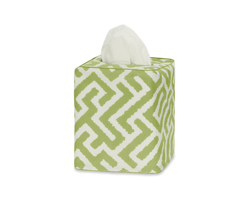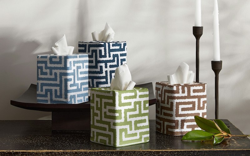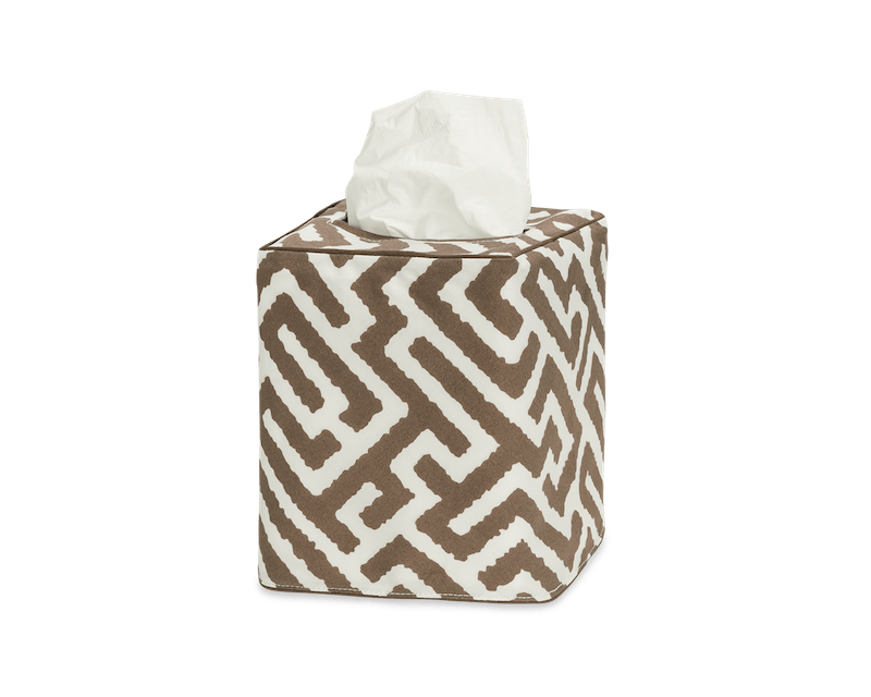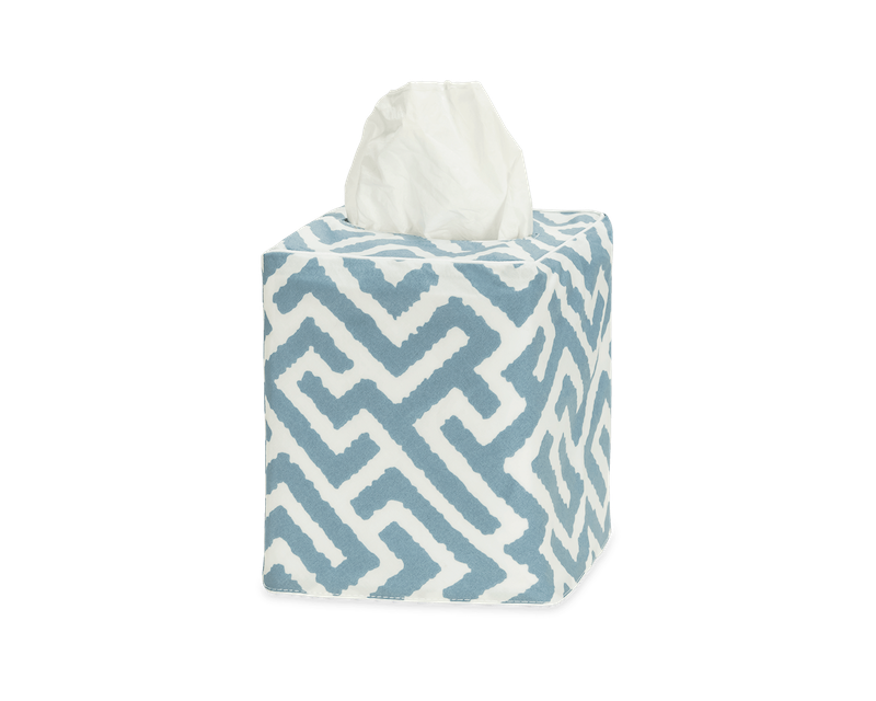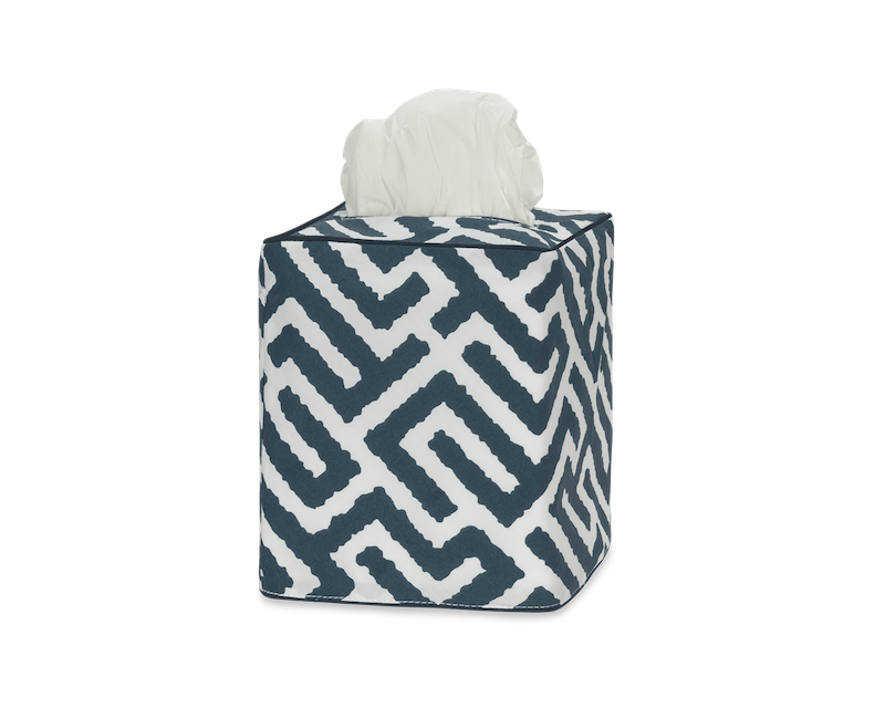 Matouk's Schumacher Gabriel Tissue Box Cover is a Schumacher print featuring a striking geometric motif. Reminiscent of a finely woven tapestry, its design introduces dynamic movement and dimension to the bed—boldly graphic yet elegantly refined. Cut from larger fabric; pattern may not be exactly as shown. 100% linen woven and printed in Portugal. Made in the Philippines of fabric from Portugal.
