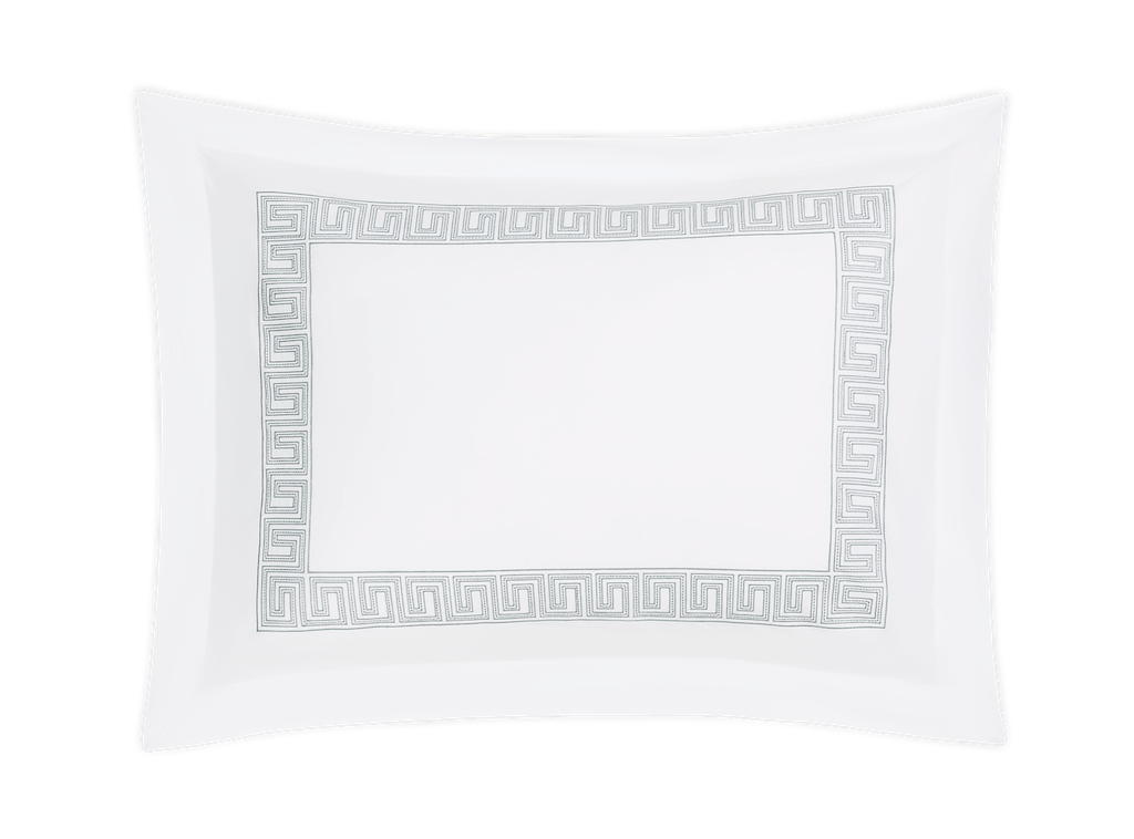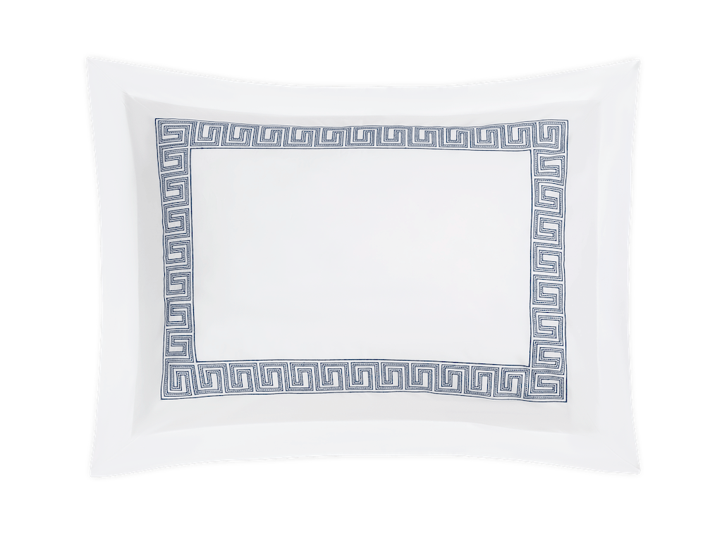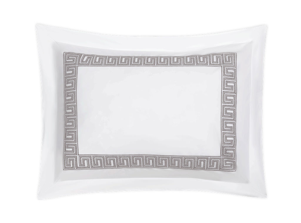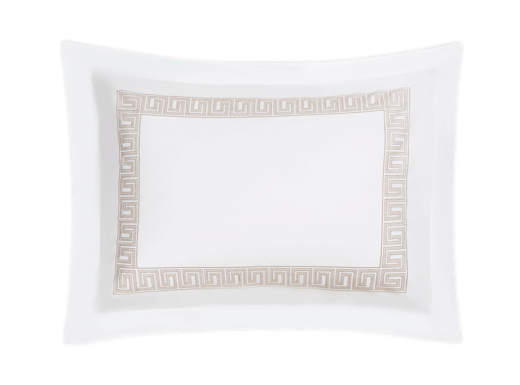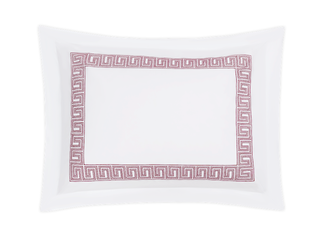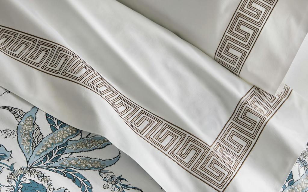 Matouk's Ophelia has an intricately beaded Schumacher tape that is boldly embroidered in a traditional Greek key pattern with a bespoke sensibility. Flat sheets have a 30" embroidery return. Shams have 2" flange except the boudoir. The boudoir sham has a 1" flange. Ceylon 520 thread count cotton percale. Fitted sheets are Ceylon sheeting. Available in several color choices. Made in the Philippines of fabric from India.