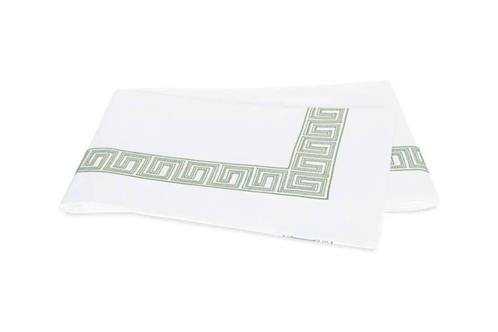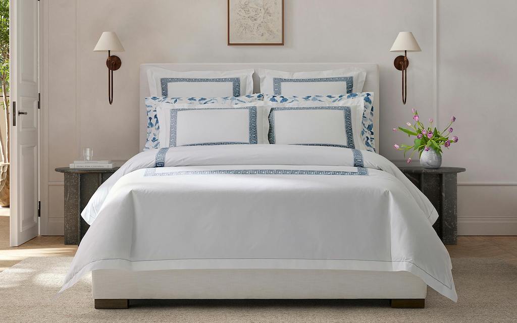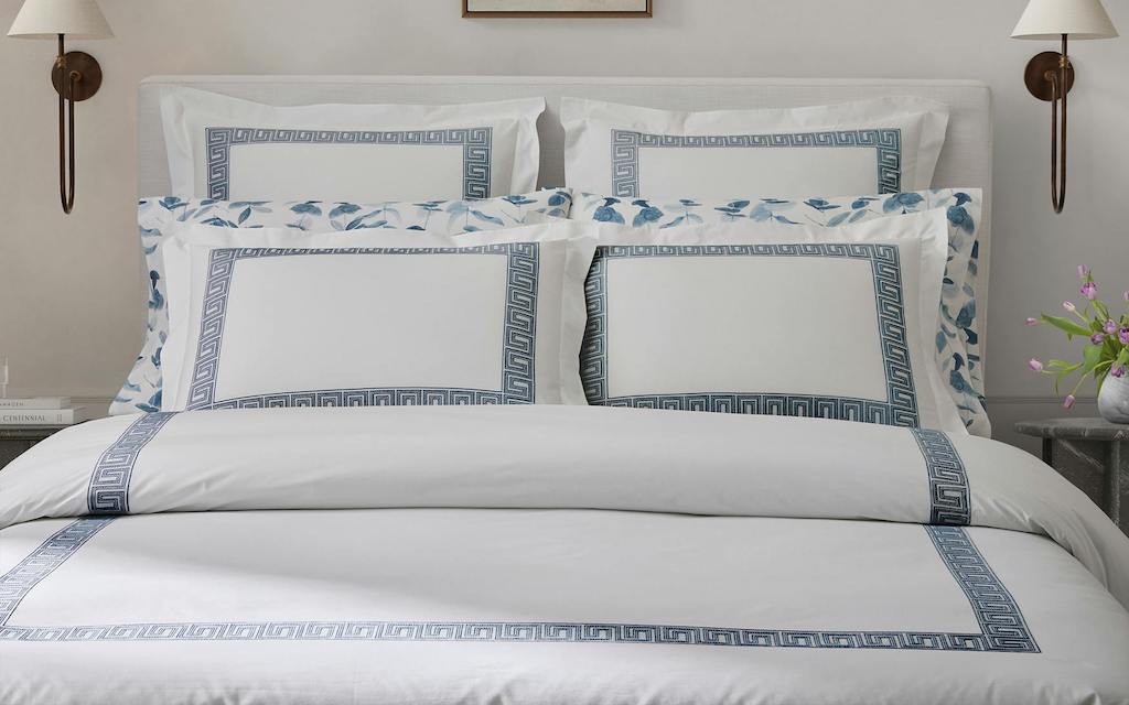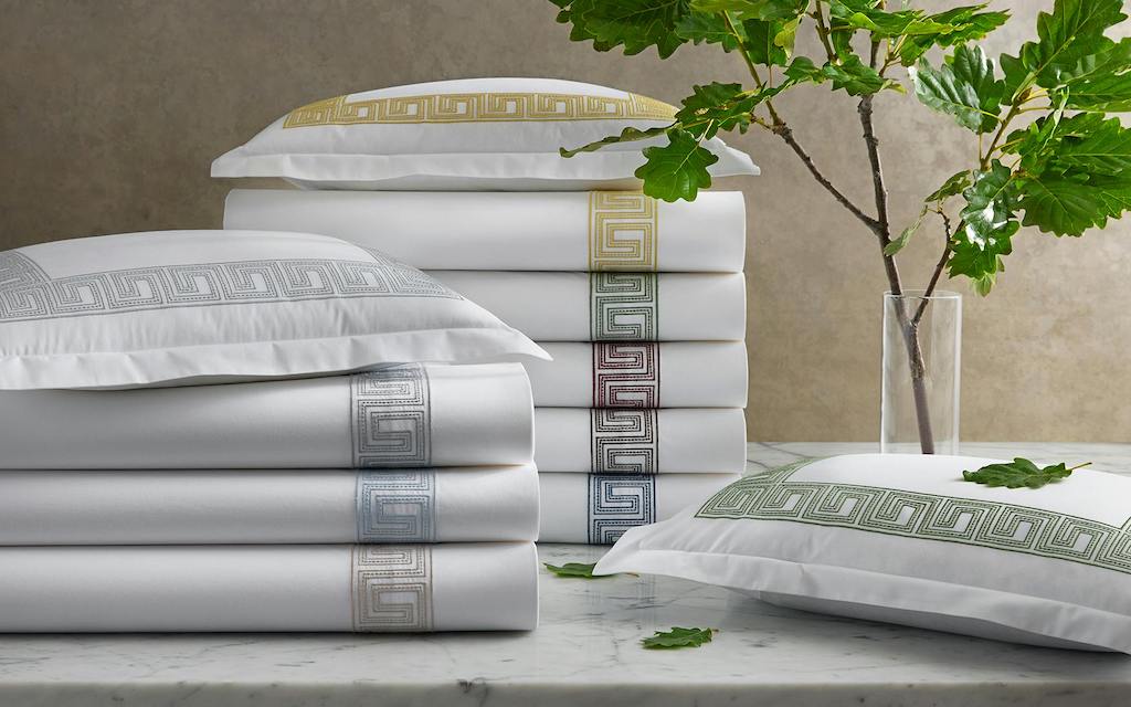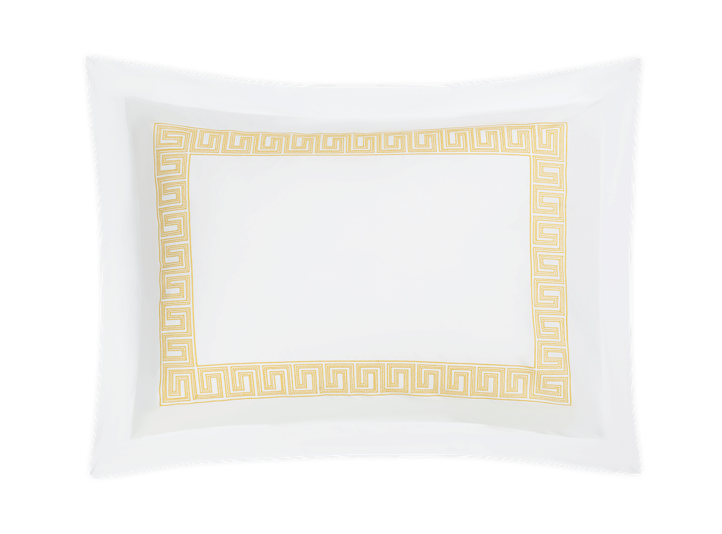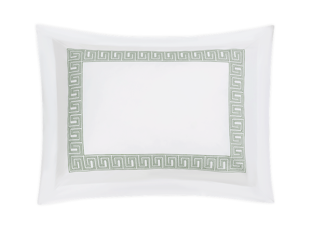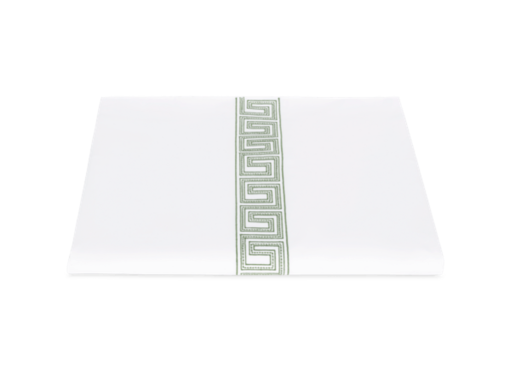 Matouk's Ophelia has an intricately beaded Schumacher tape that is boldly embroidered in a traditional Greek key pattern with a bespoke sensibility. Flat sheets have a 30" embroidery return. Shams have 2" flange except the boudoir. The boudoir sham has a 1" flange. Ceylon 520 thread count cotton percale. Fitted sheets are Ceylon sheeting. Available in several color choices. Made in the Philippines of fabric from India.