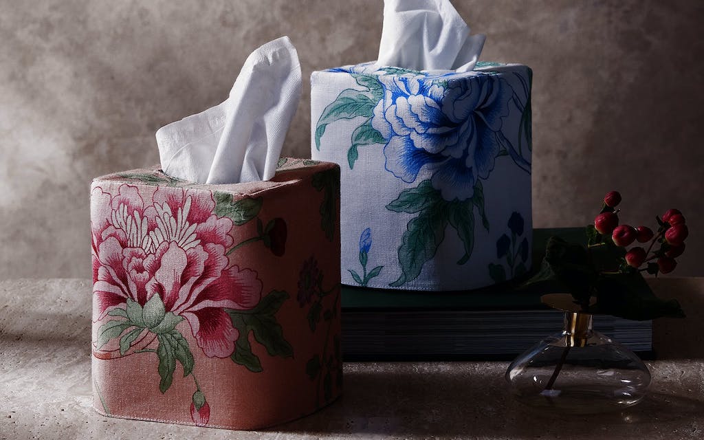 Matouk's Simone Tissue Box Cover is a 100% linen cover. These fabric covers transform the humble tissue box with a range of eye-catching prints and embroidery designs, each selected from the Schumacher archive and reinterpreted in signature Matouk