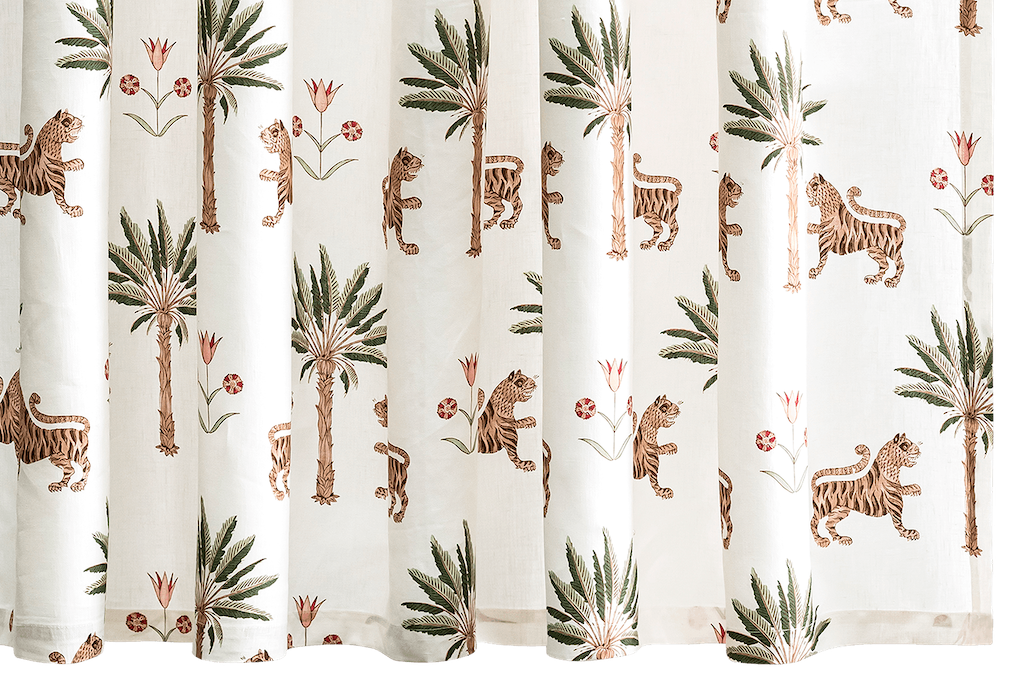 Matouk's Tiger Palm Shower Curtain is enchanting. This original Schumacher design on soft linen was inspired by antique eastern block prints. Palms, tigers and sweet floral make a delightful backdrop for your gatherings. 100% linen. Made in the USA of fabric from Portugal.