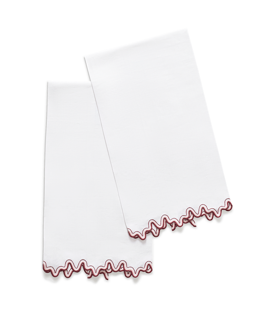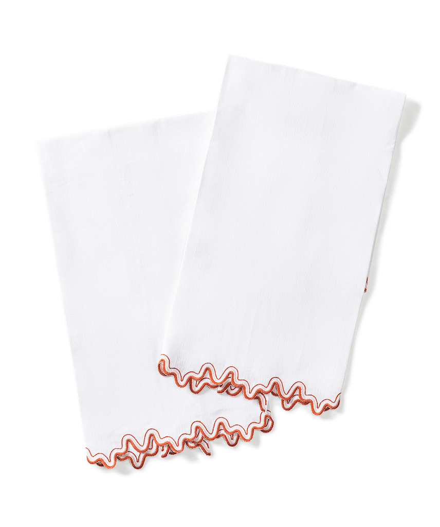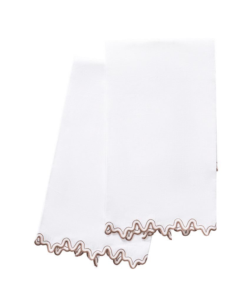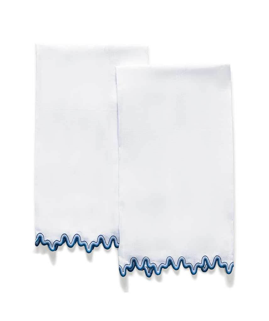 Matouk's Wave Guest towels are guaranteed to add a splash of joie de vivre to your powder room. Meticulously embroidered, it features a two-tone wave border on linen. Set of two. 100% linen. Made in the Philippines of fabric from Portugal.