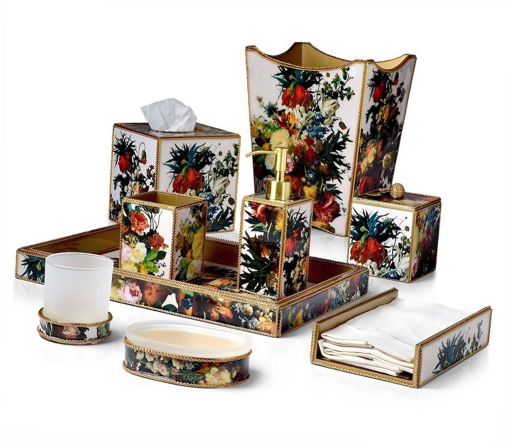 Mike + Ally's Bouquet Luxury Bath Accessories are breathtaking. Wake up each morning to gorgeous blooming flowers. This refreshing collection is hand built using a digital print and clear coat enamel finish. It is then accented with gold or silver French twist chain. Simply breathtaking. Mike + Ally products are handcrafted by artisans. Small irregularities in shape, surfaces and finishes are hallmarks of such craftsmanship and are not defects.