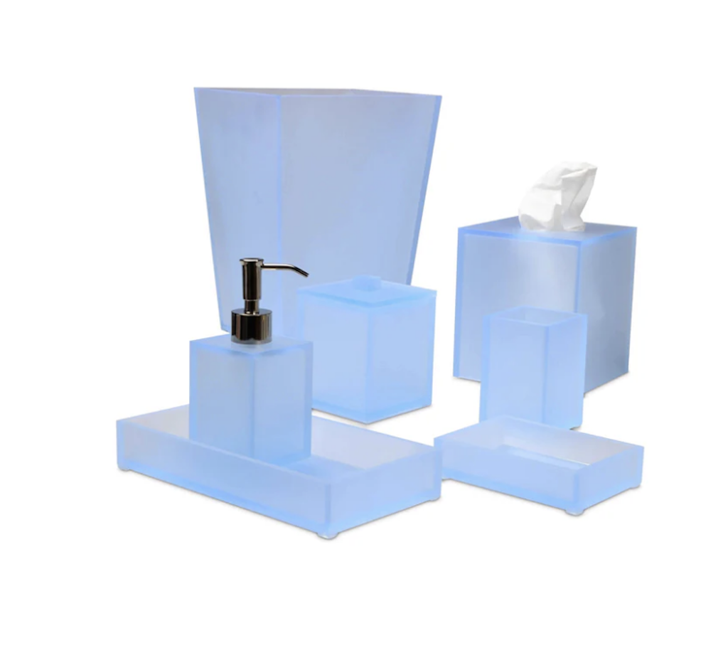 Mike + Ally's Ice Luxury Bath Accessories has been mastered by M+A. They only use high quality 3/8" thick clear Lucite. It is then hand cut, assembled, polished and glued to a seamless finish. This collection coordinates with an array of bathroom décors. Choose between gold or silver pump and gold or silver boutique box liner.