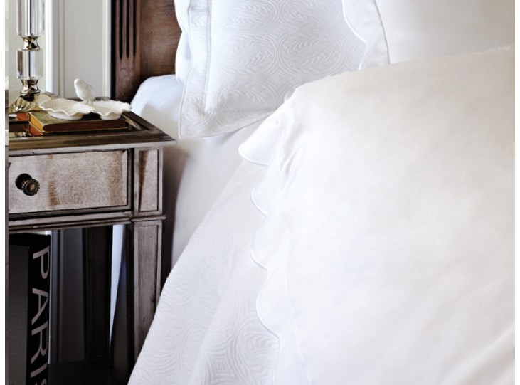 A 300 thread count sateen, Overture has a taped scallop on the pillowcases and flat sheet. 100% Egyptian cotton made in Portugal. Available in white or ivory. One of our most popular sheets from Peacock Alley -- makes a lovely bed!