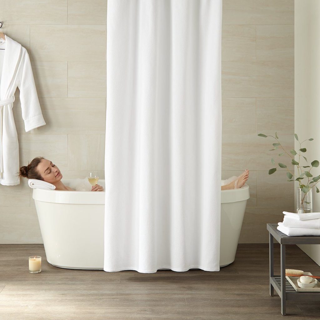 Peacock Alley's Spa Shower Curtain is a modern update on a classic. The simple, sophisticated design of the Spa Shower Curtain works beautifully with any color scheme or design aesthetic. Available in a shower curtain and a bathrobe. Constructed with a textural flat weave and 12 button holes along the top for hanging. Shower curtain hooks/rings not included. 100% Cotton/430 gram weight. Made in Portugal.