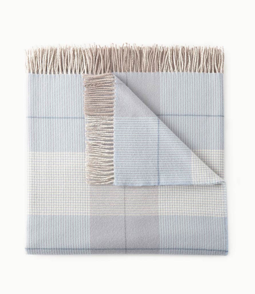 Peacock Alley's fringed York Merino Wool Plaid Throw blanket is made of 100% super-fine Merino wool. Merino fiber absorbs and retains up to 30% of its own weight in moisture and still feels dry to the touch. True 4 season fiber: behaves similar to the skin as it naturally cools and heats as the body needs. Naturally static resistant, no itch due to diameter of fiber and its flexibility. 100% Merino wool. Sourced from a 180 year old family mill in Italy, and made in Lithuania.