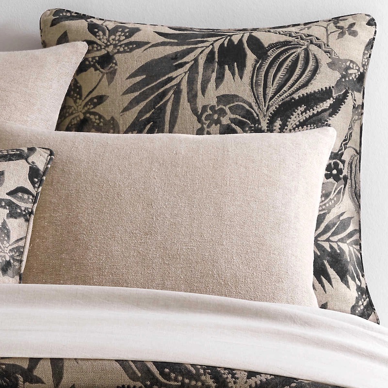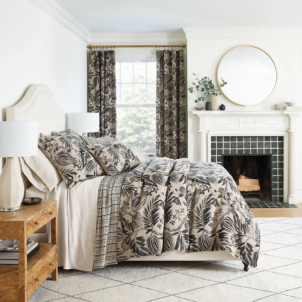 Pine Cone Hill Antigua in Black will make a bold bedroom statement with a large-scale botanical print that hints at lush fruits and foliage. This dramatic duvet cover and shams feature inky black fronds, buds, and pods digitally printed onto rustic natural linen, then washed and tumbled to sublime perfection.  100% Linen. Handmade.