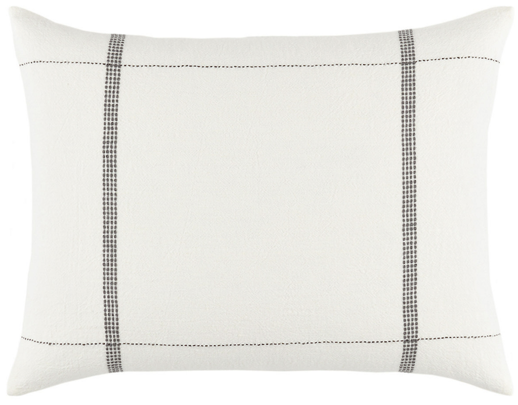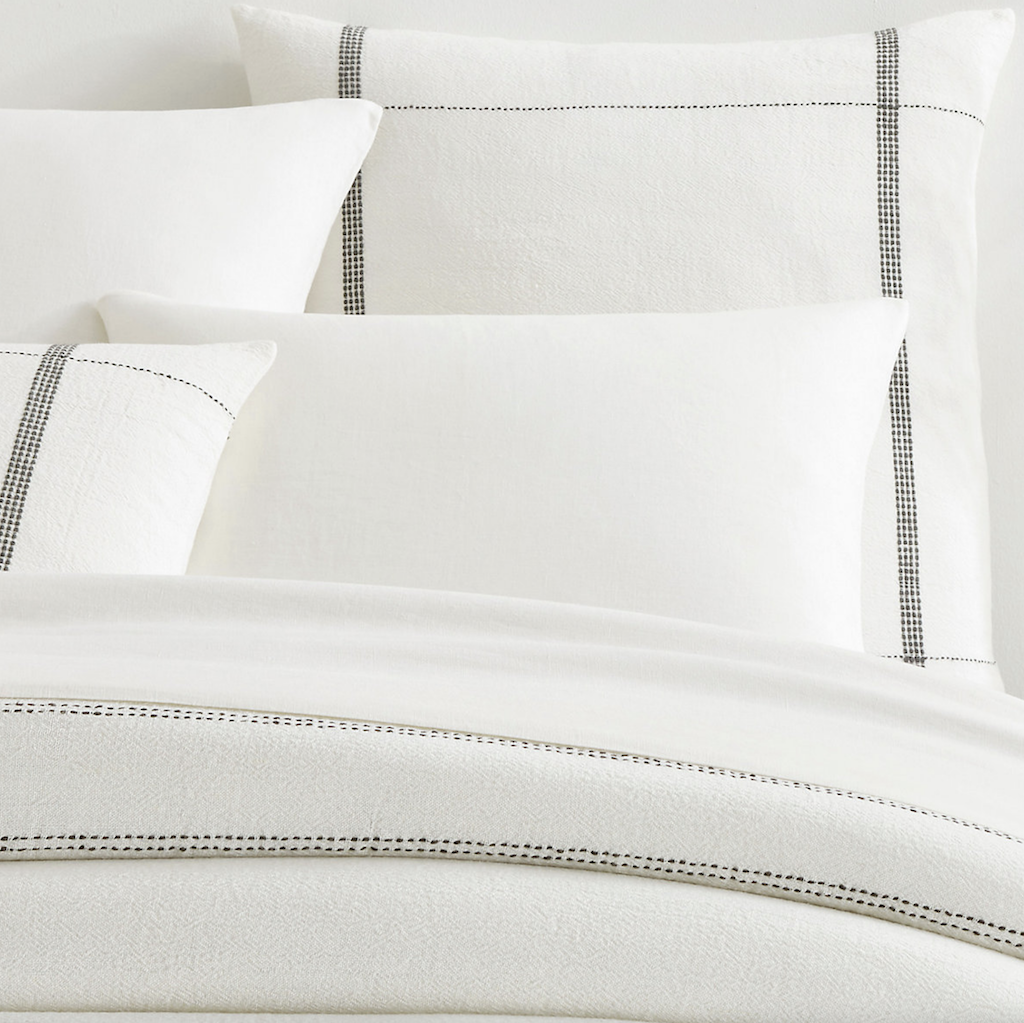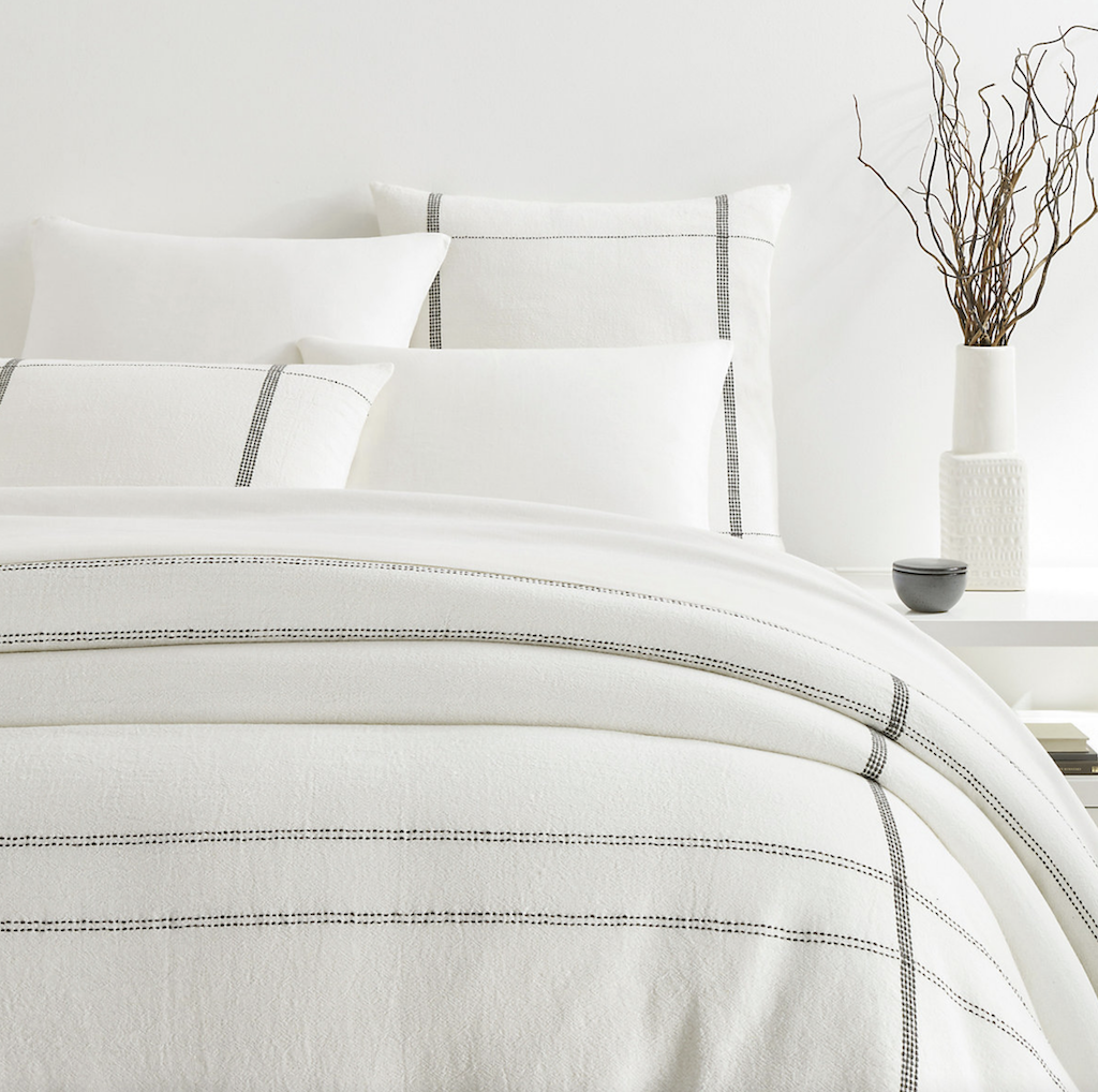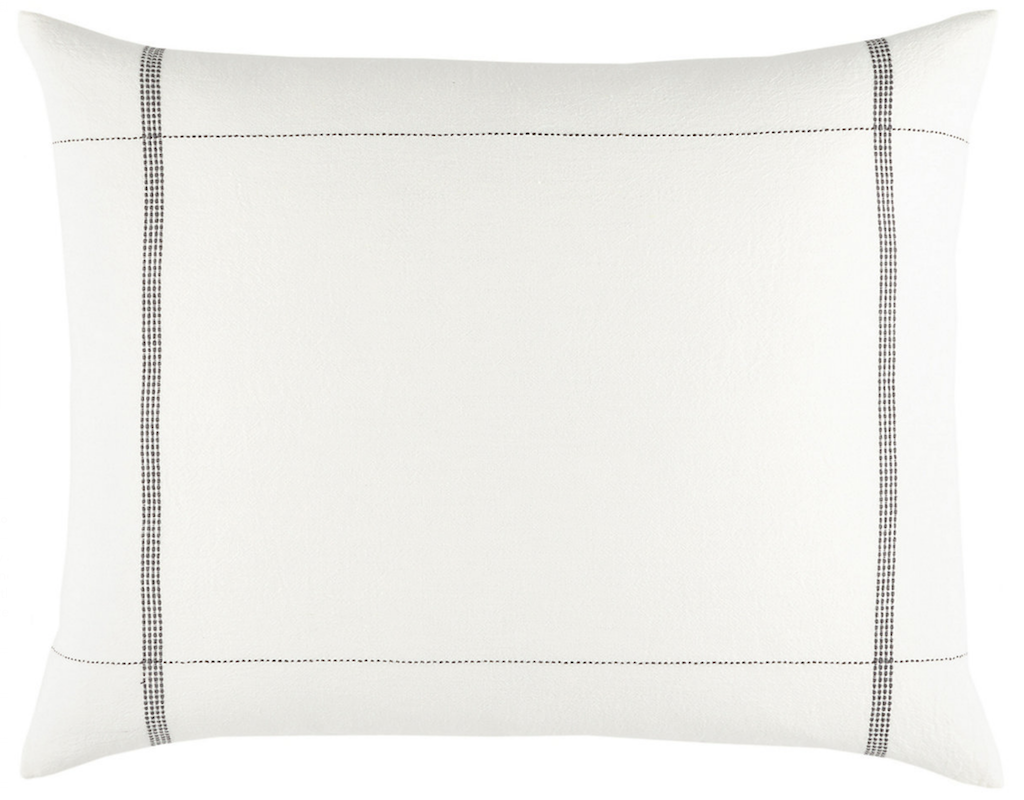 Pine Cone Hill's Atherton Grey boasts large windowpane checking that will add a modern farmhouse aesthetic to any decor. Subtly engineered to resemble hand stitching, the heirloom flaxen quality softens with every wash, with very little wrinkling, and is made to last a lifetime. It was inspired by antique homespun grain sacks. Knife edge finish. Shams have tie closures. Duvet has hidden button closure and knife edge finish. Inside corner ties to help keep duvet insert secure. Handmade 55% Linen/45% Cotton.