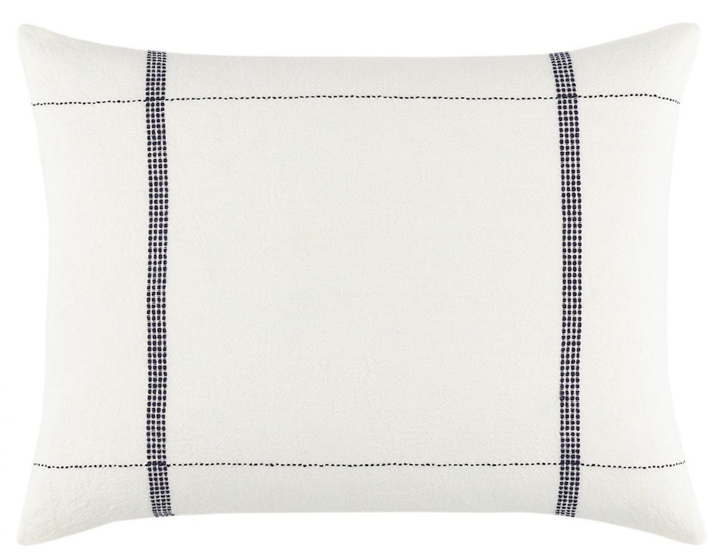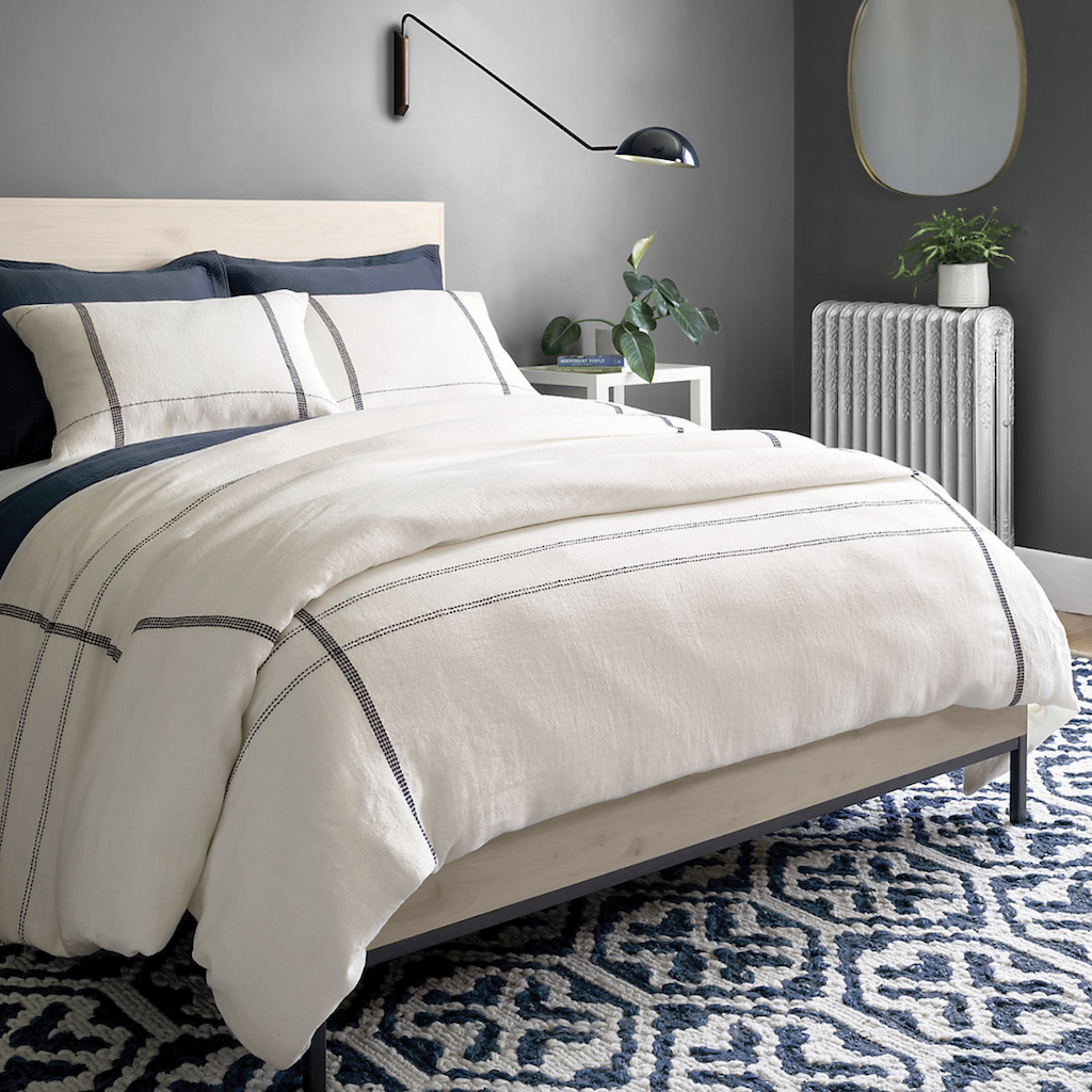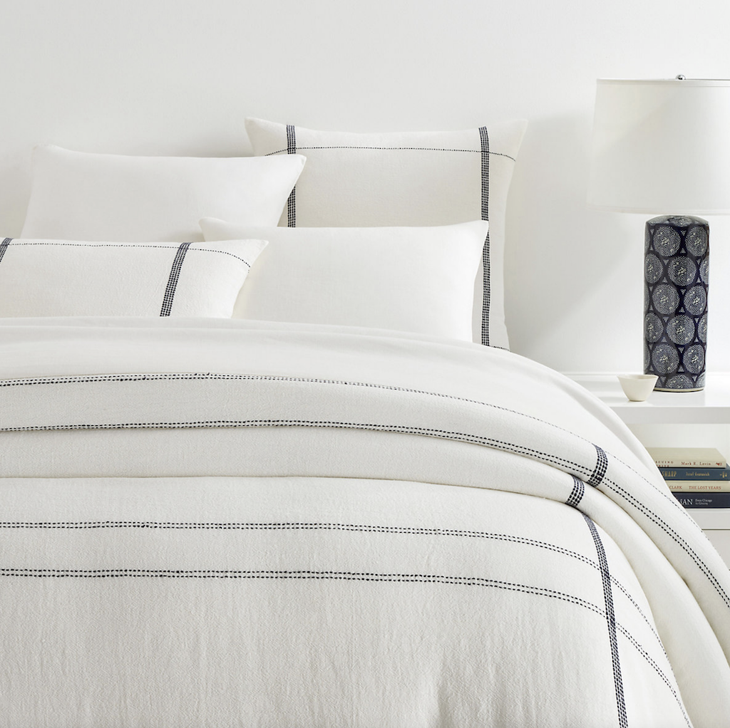Pine Cone Hill's Atherton Navy was inspired by antique, homespun grain sacks, the Atherton Duvet Cover boasts a large windowpane check that will add a modern farmhouse aesthetic to any decor. Subtly engineered to resemble hand stitching, the heirloom flaxen quality softens with every wash, with very little wrinkling, and is made to last a lifetime. Duvet has hidden button closure. Inside corner ties to help keep duvet insert secure. Shams have closure ties.