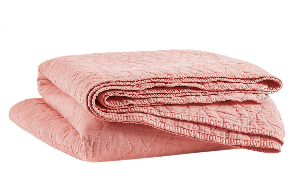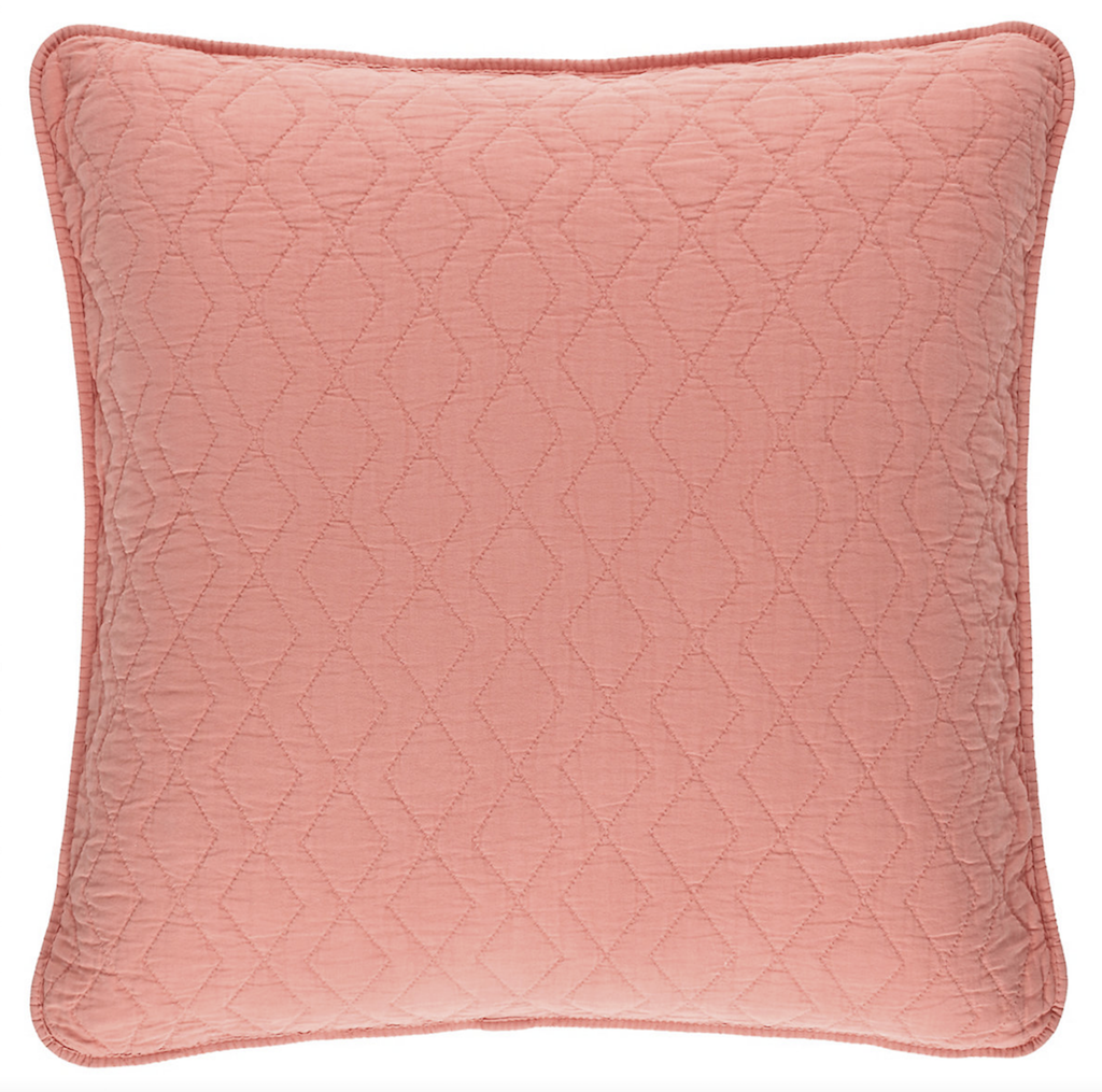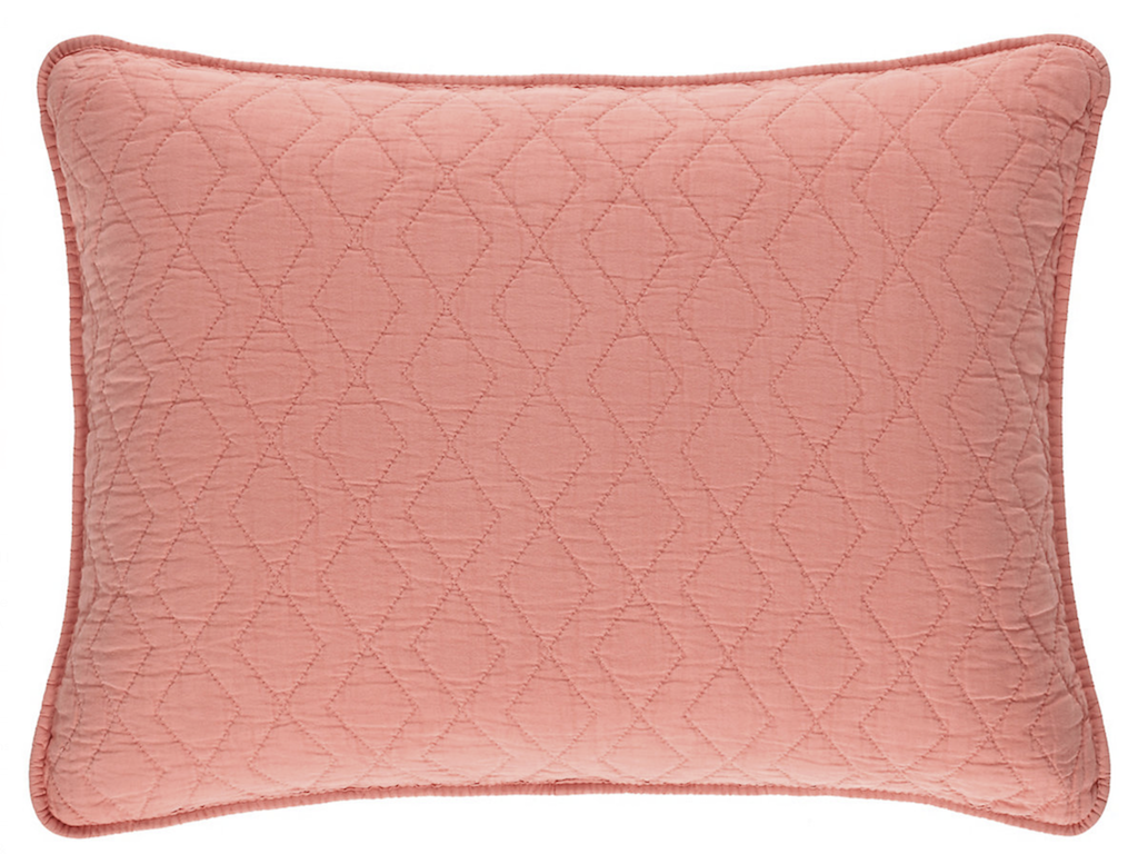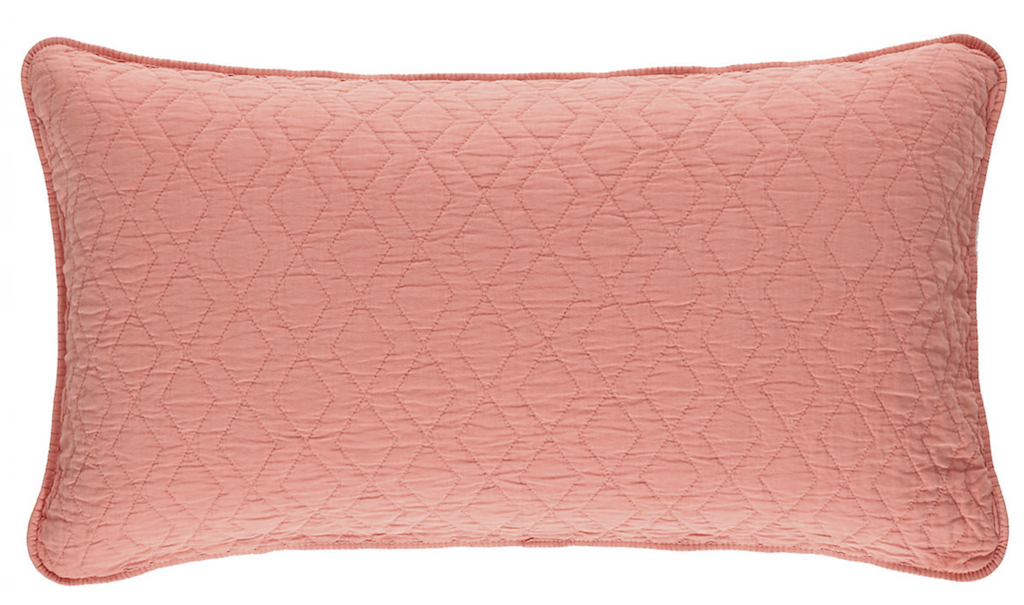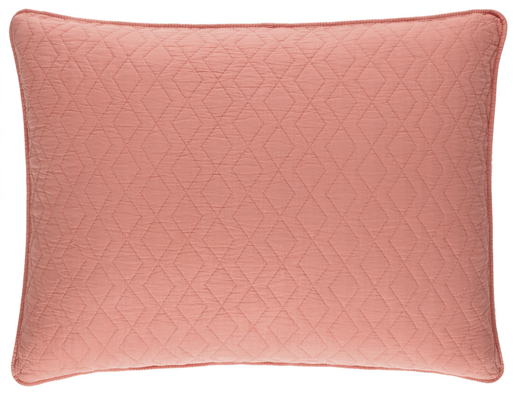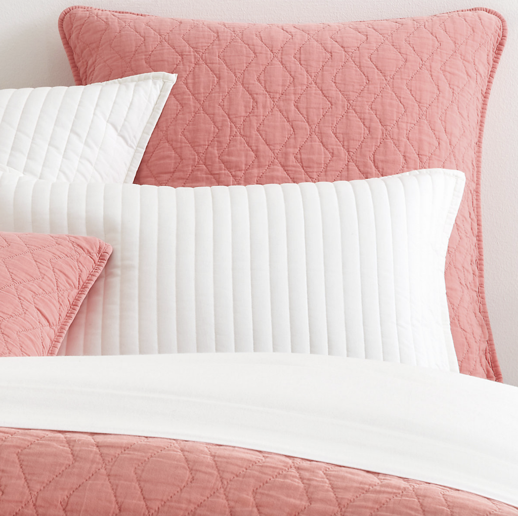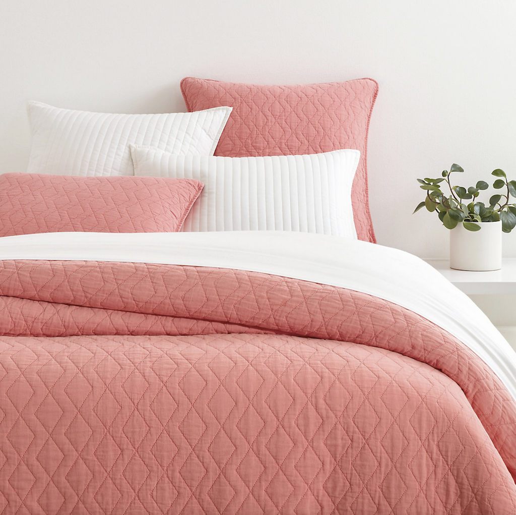 Pine Cone Hill's Birdie Coral is supremely soft and woven with a lived-in texture. A stitched geometric diamond detail lends visual interest and loft. Closure ties on the shams except Dutch Euro. It has a zipper closure. Twin/Twin XL quilts have a longer fit to accommodate both standard twin and twin XL dorm mattresses.