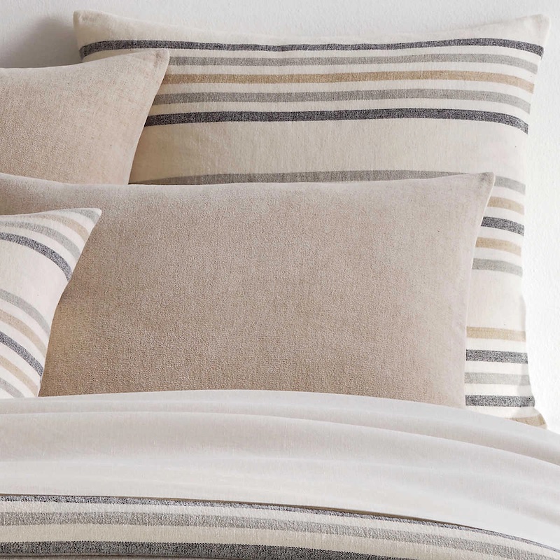 Pine Cone Hill's Ellison Stripe Linen Chenille Ivory's pattern is soft to the touch with a fantastic drape. This luxurious linen chenille duvet cover adds a modern graphic edge in Charcoal, Grey, and Natural stripes on Ivory. The subtle suede texture is woven from velvety chenille yarn in a fantastic blend of cotton for softness, linen for texture and strength, and viscose for a silky drape.