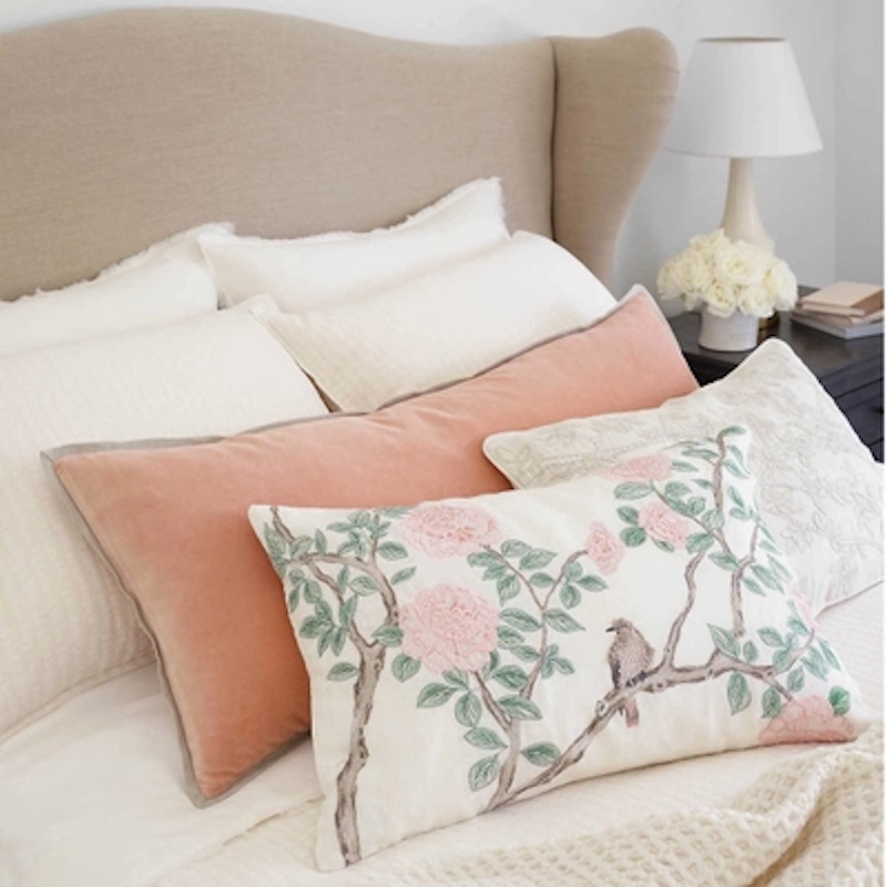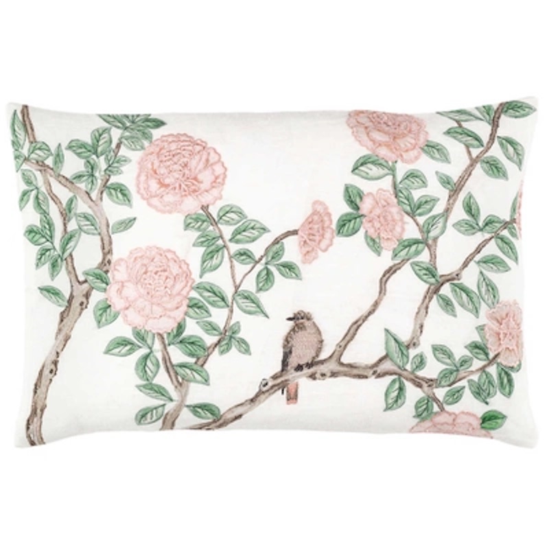 Pine Cone Hill's Jolie Embroidered in White was designed by Marie Flanigan, an award-winning interior designer, for Pine Cone Hill.  The pillow reflects her signature style of timeless elegance and innovative simplicity.  The beauty stylized botanical painting  is further embellished with satin stitch embroidery.  An enchanting focal point for a seating area or bed, the sheen of the thread catches the light, drawing attention to the depth and detail of the design.  Printed on a natural linen cushion.  Single side pattern with solid linen reverse. Knife Edge. Zipper closure.  100% Linen base with 100% Rayon embroidery.  Handmade.