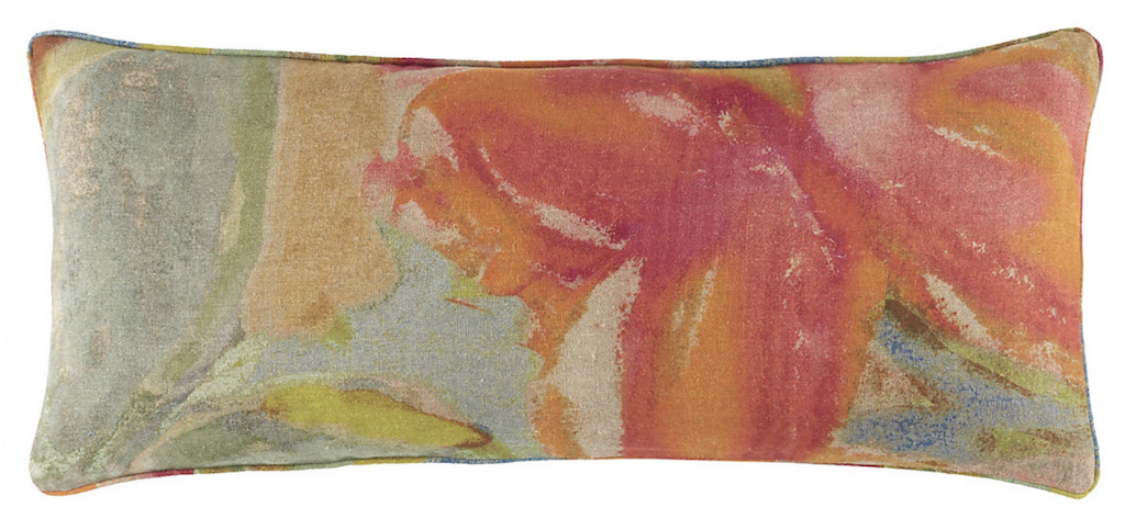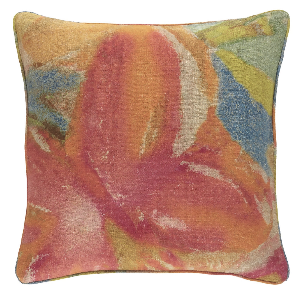 Pine Cone Hill's Joy Linen Multi Decorative Pillows have a gorgeous print that was inspired by a paper vintage dress their designers discovered at the famous Brimfield Antique Market in Massachusetts. It is abstract and colorful. They are digitally printed on both sides!