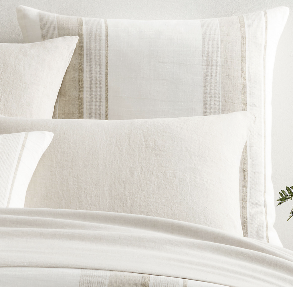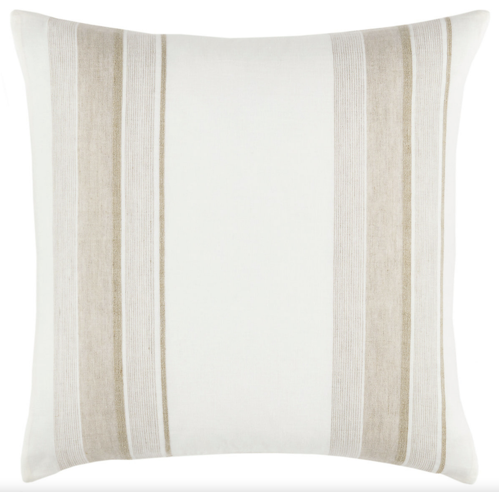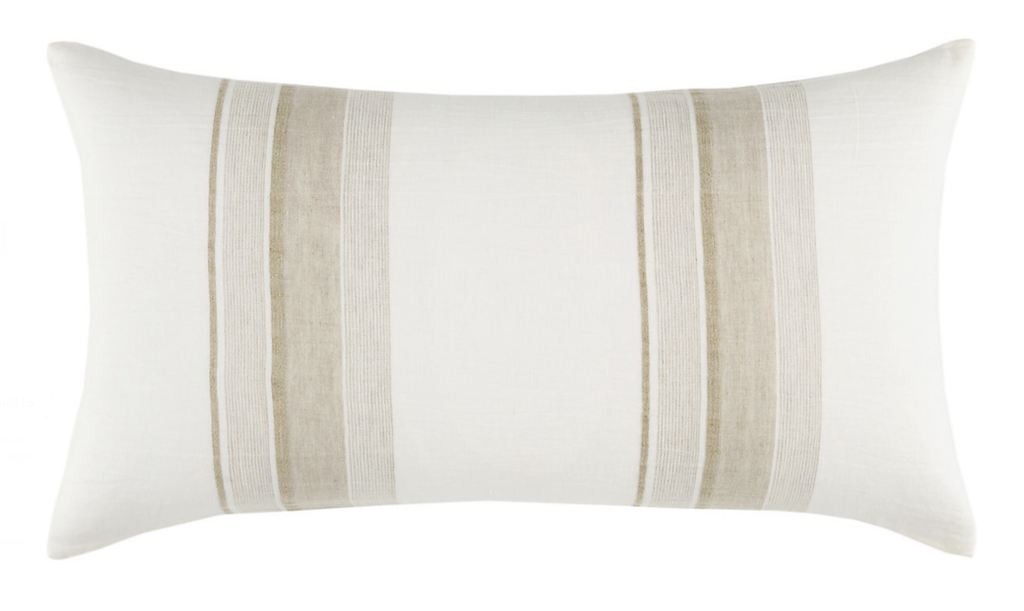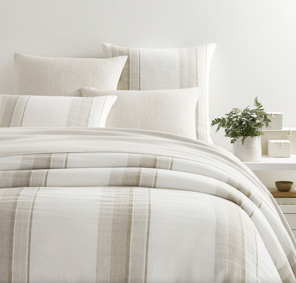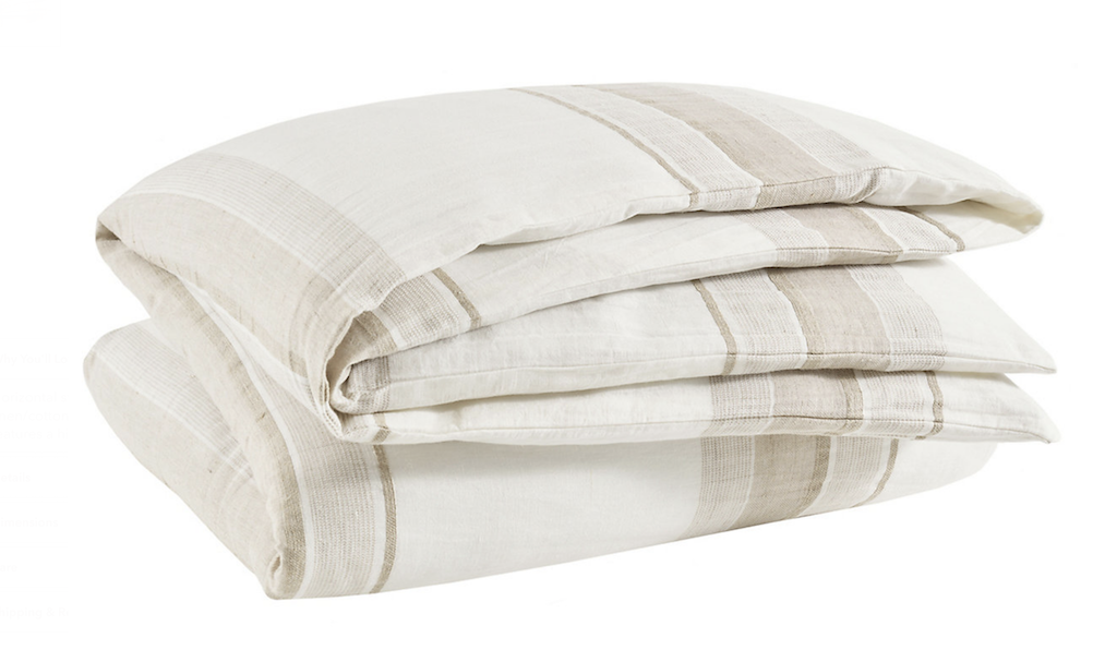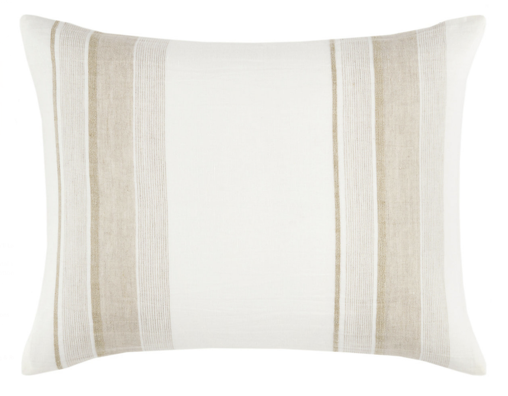 Pine Cone Hill's Napa Stripe Linen Natural pattern has a classic appeal. The design consists of horizontal stripes in shades of natural and ivory on a lightweight linen/cotton blend that gives this collection a timeless look. We love that it features a hidden button closure and corner ties to keep it securely in place. Shams have tie closures. Handmade. 52% Linen/48% Cotton.